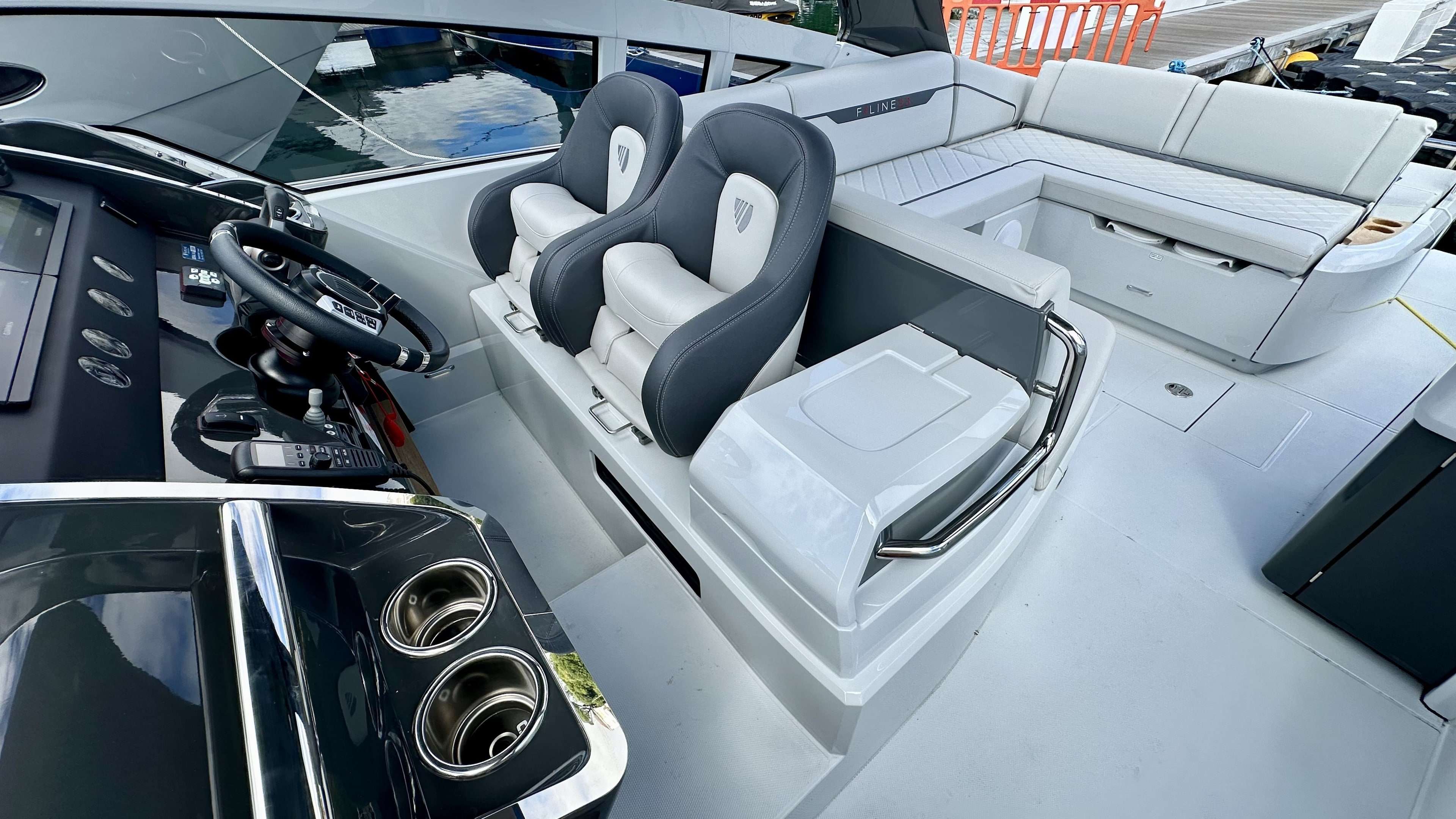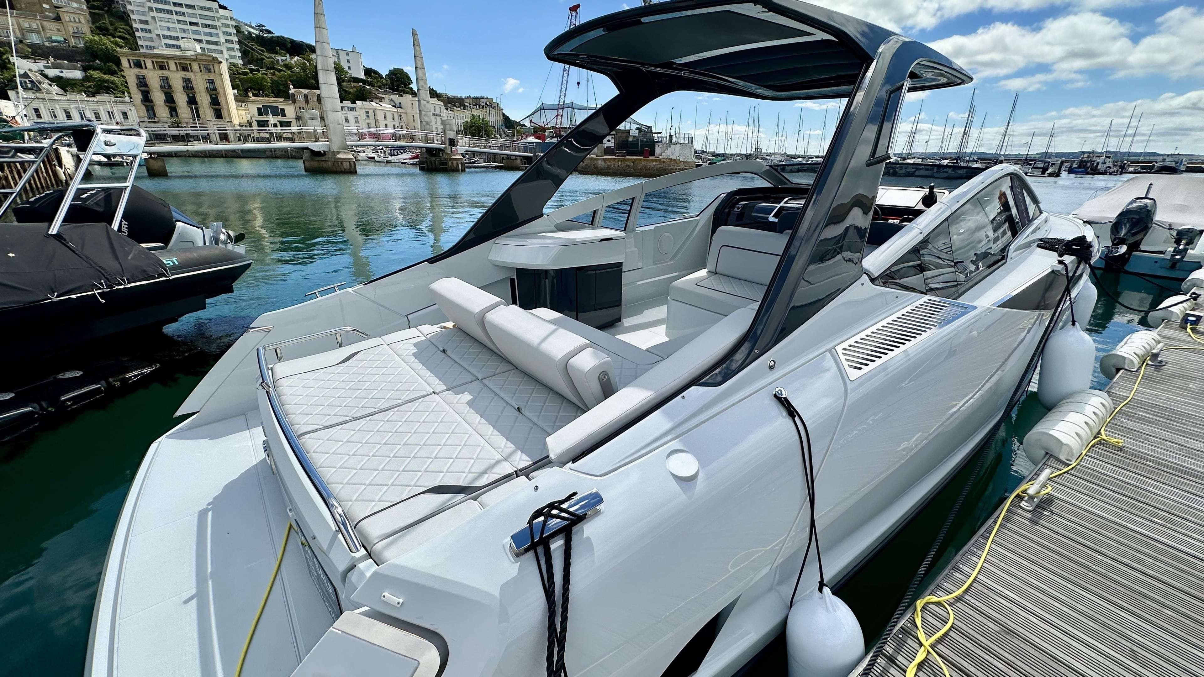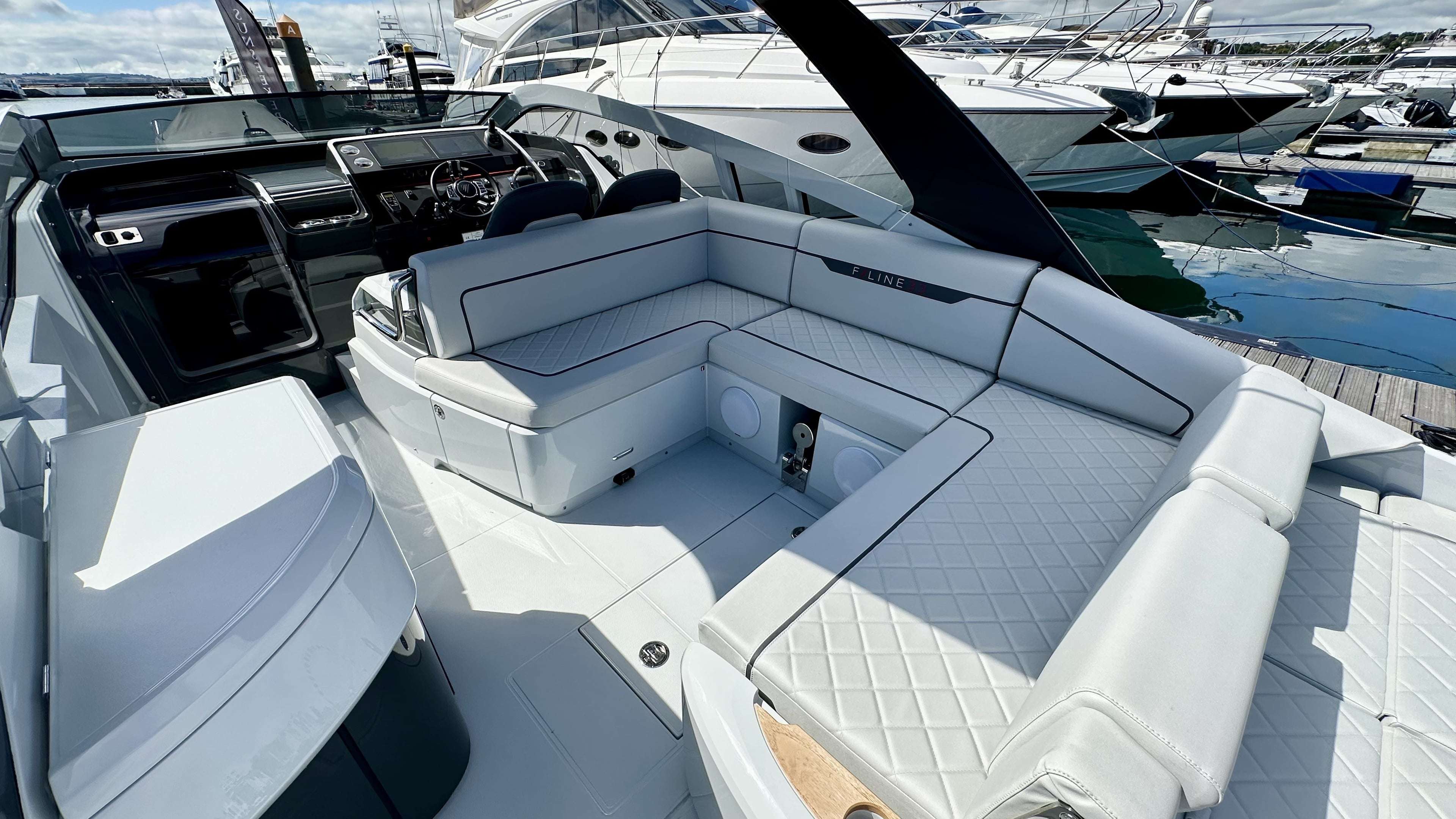 2023 Fairline F//Line 33 fitted with twin Volvo v8-430hp petrol engines - One owner with low hours use. A beautifully sculptured day boat with a nice selection of options to include twin Garmin 12″GPSMap Chartplotter Touchscreen Display To Helm // 32″ mirror TV with Apple TV, Fusion Apollo Audio & Speakers To Saloon // Anchor Upgrade; 30m of 8mm Stainless Steel Chain // Antifoul Black // Bed Conversion To Saloon With Manual Pedestal // Camera To Bow (Only Available With TV) // Exterior Mood Lighting: Transom, Side Decks & Illuminated F//Line Badge To Bow // External Upholstery Movida Aluminium/Graphite // Foredeck Sunbed Cushions With Cupholders & Cover // Fridge (42 litre) to saloon // Fridge, Electric Griddle To Cockpit Bar // Isotherm Drawer Ice Maker // Fusion PLUS audio With Additional Speakers, Subwoofer & Amplifier To Cockpit // Garmin 800(i) Automatic Identification System // Generator With Hydrohush Exhaust System // Hardtop With Mast & Ancillaries // Interior Mood Lighting; LED Light Panels To Saloon & Dimmer Switches // Joystick Control // Light Grey Hull Colour // Random Oak Saloon Flooring Dove Grey // Removable Front, Side & Back Panels To Hard Top // Saloon & Cabin flooring Paradise Hidden Cover // Saloon Sofa Wicker & Seely Leather // Teak Cockpit Table With Cantilever Pedestal For Stowaway // Teak To Cockpit Floor // Timber Walnut Gloss // Tonneau Cover // Underwater Transom Lights x2 (Dual Colour Blue / White) // Wireless Phone Charger To Helm - For more information please call Boats.co.uk on 01702 258885 or email sales@boats.co.uk
