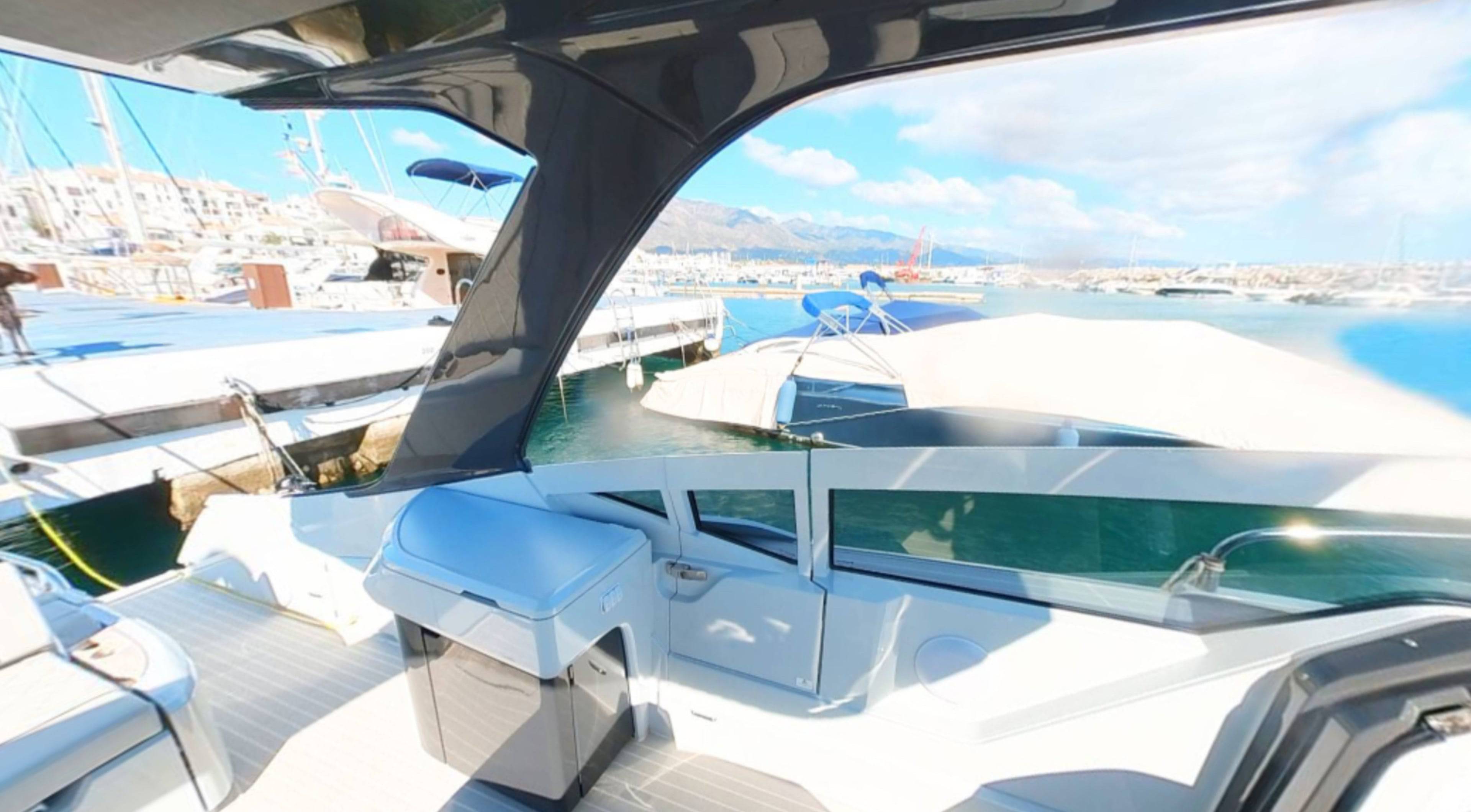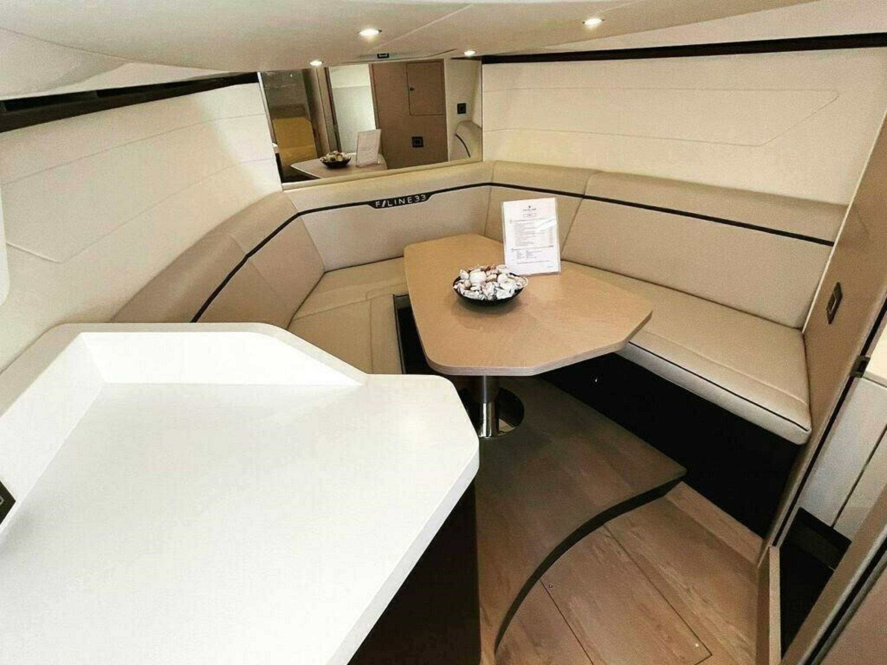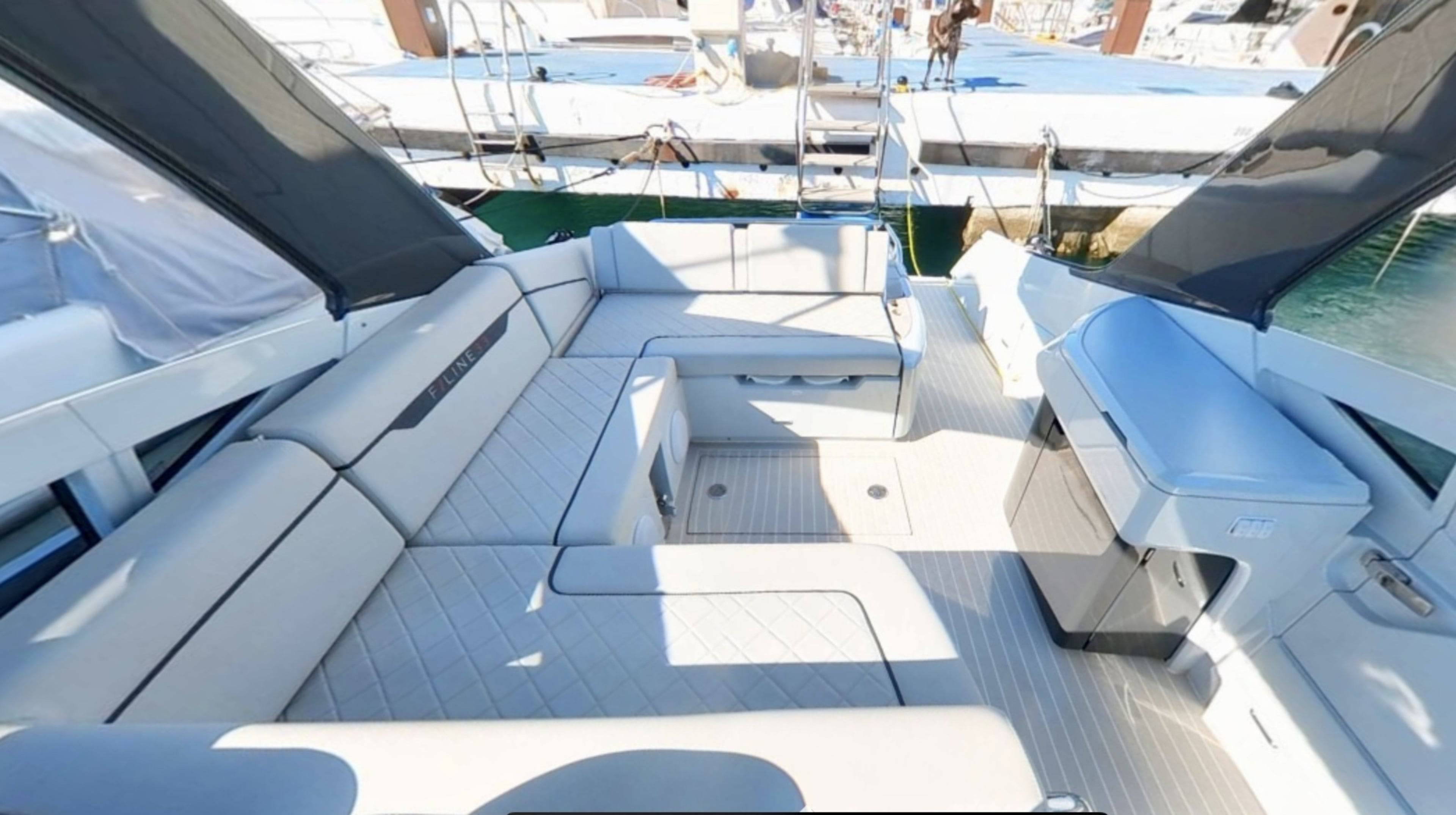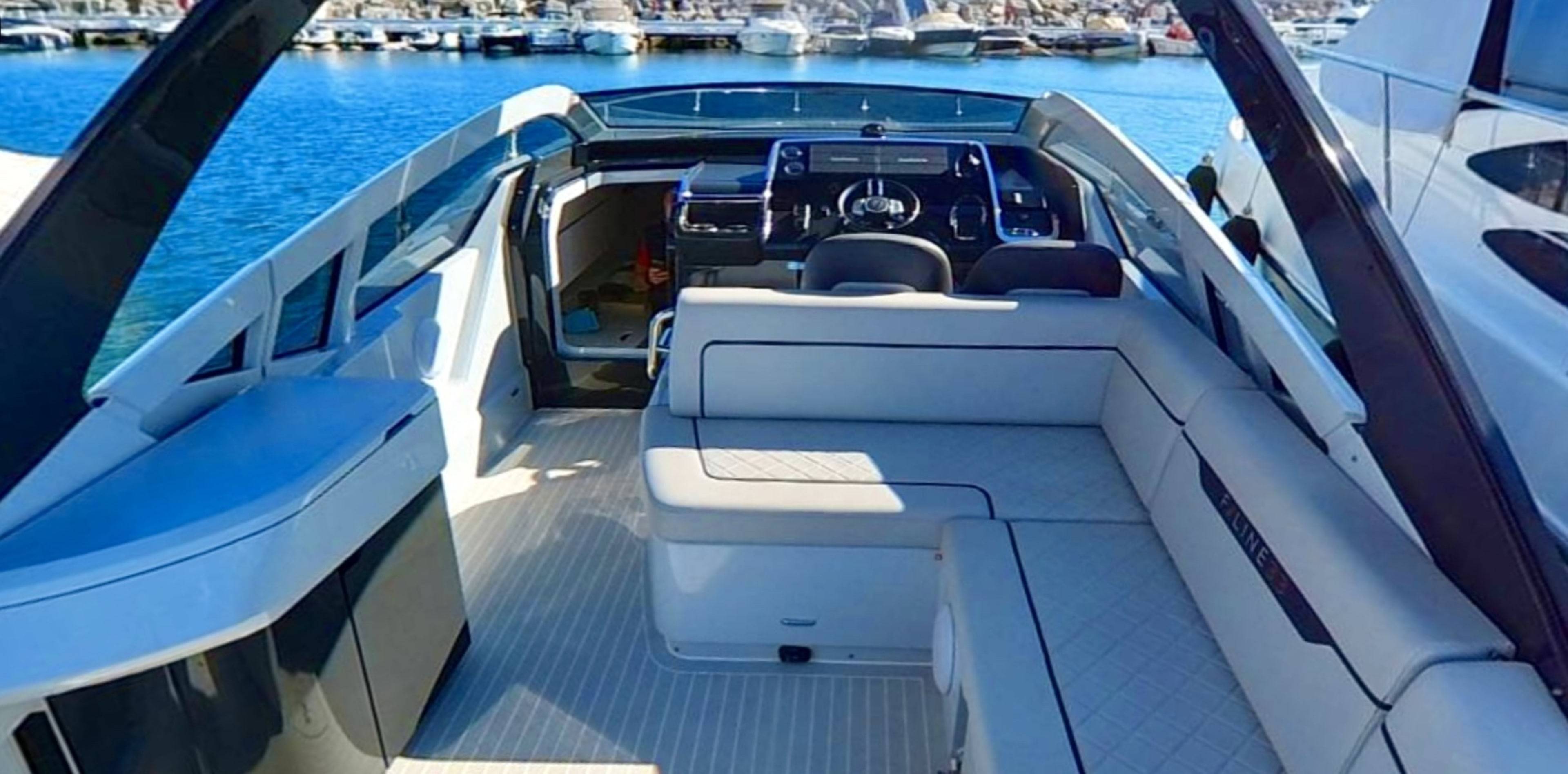 2023 FAIRLINE F//LINE 33 HARD TOP with TWIN VOLVO V8 PETROL ENGINES // Only 77 hours // Joystick // Bow Thruster // Generator // Air conditioning. This stunning Fairline F Line 33 is a very well optioned boat, with the more desirable "Hard Top" that has a canvas sunroof allowing shade or sunshine when required. Staying overnight on board at anchor is not a problem as this boat is equipped with a generator and air conditioning. There is a wetbar that has a bbq griddle, fridge and icemaker so you can cater for all on board with drinks and food. With the largest engine option available for this model (twin Volvo V8 petrols producing 480hp each) you will be able to make very good progress along the coast visiting lots of stunning beaches in no time! Currently located in Puerto Banus, Marbella.