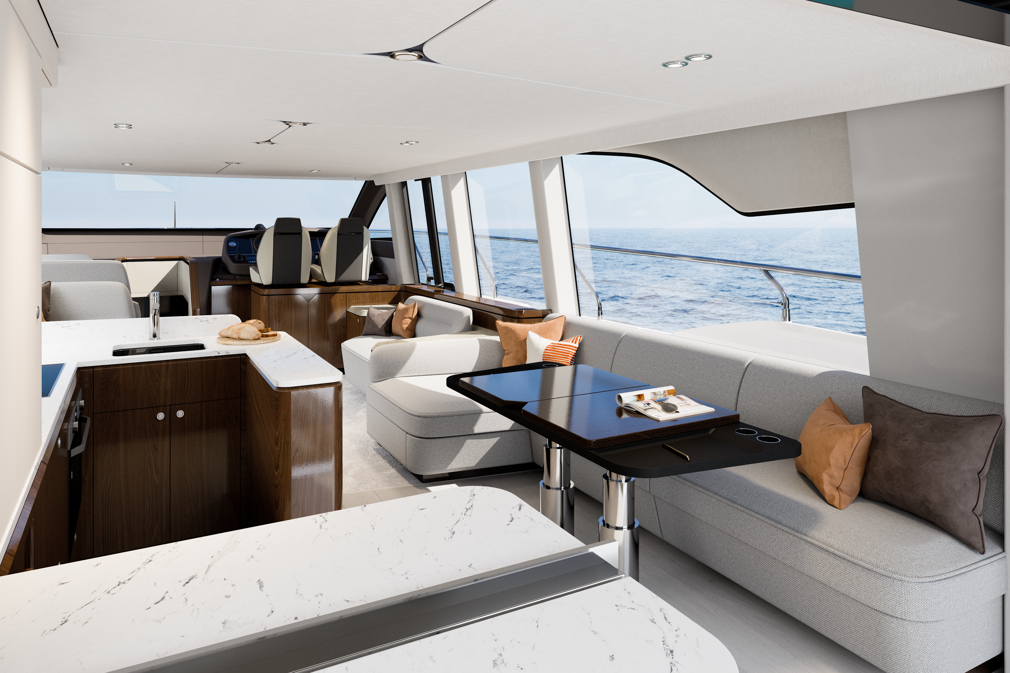 Colour Scheme - Hull; Light Grey Antifoul; Black Trim/waterline; Silver/Graphite External upholstery; Movida Aluminium with Movida Petrol Feature Band Cockpit canopy; Black Joinery and Panelling; Walnut Gloss Carpet (Cabins only) Kasia Snow Dinette; Angora Leather Port & starboard & companionway; Habitat Cloud Bedheads; Alpaka pepper / Anthracite Galley worktop; Carrara White