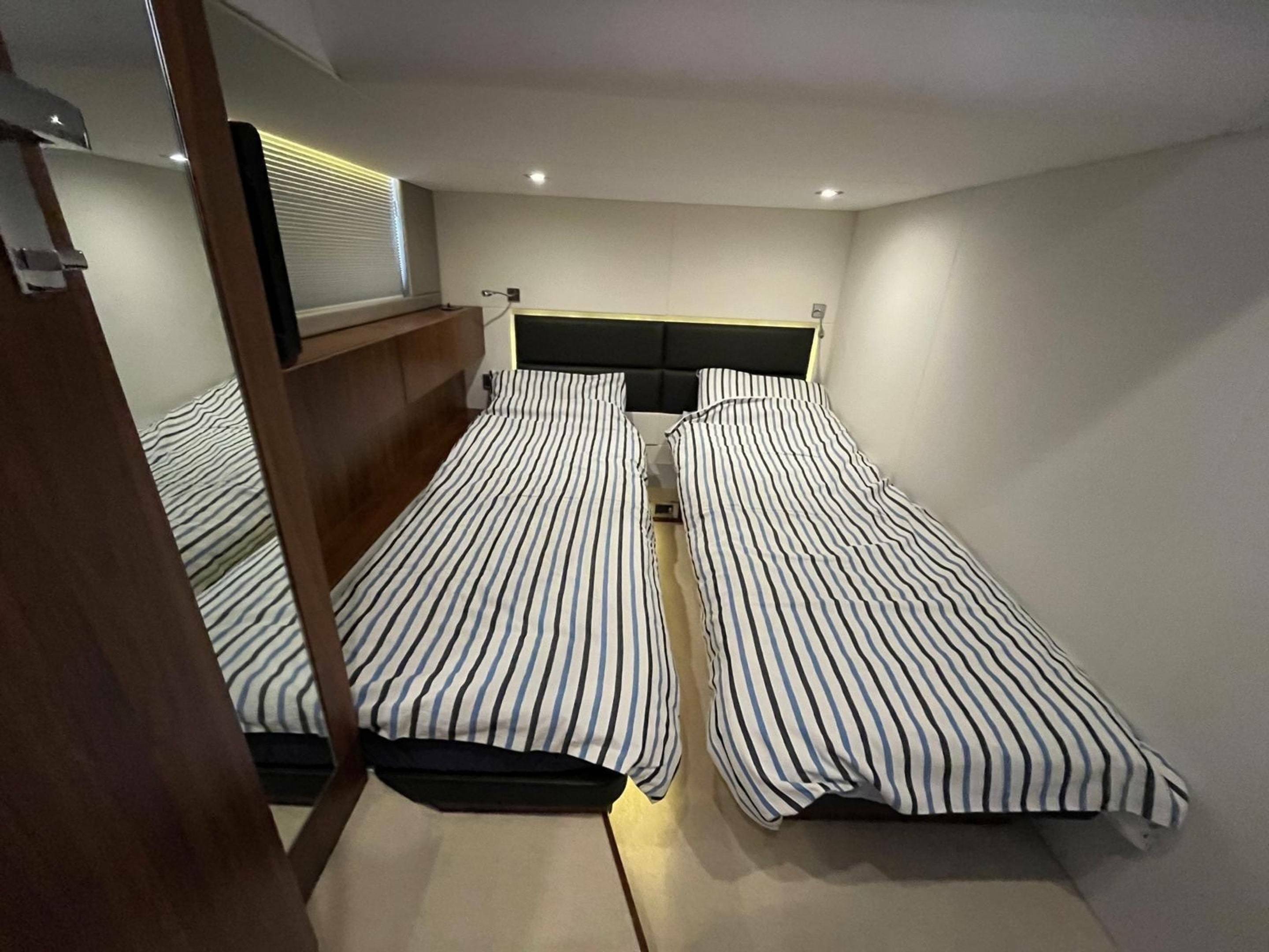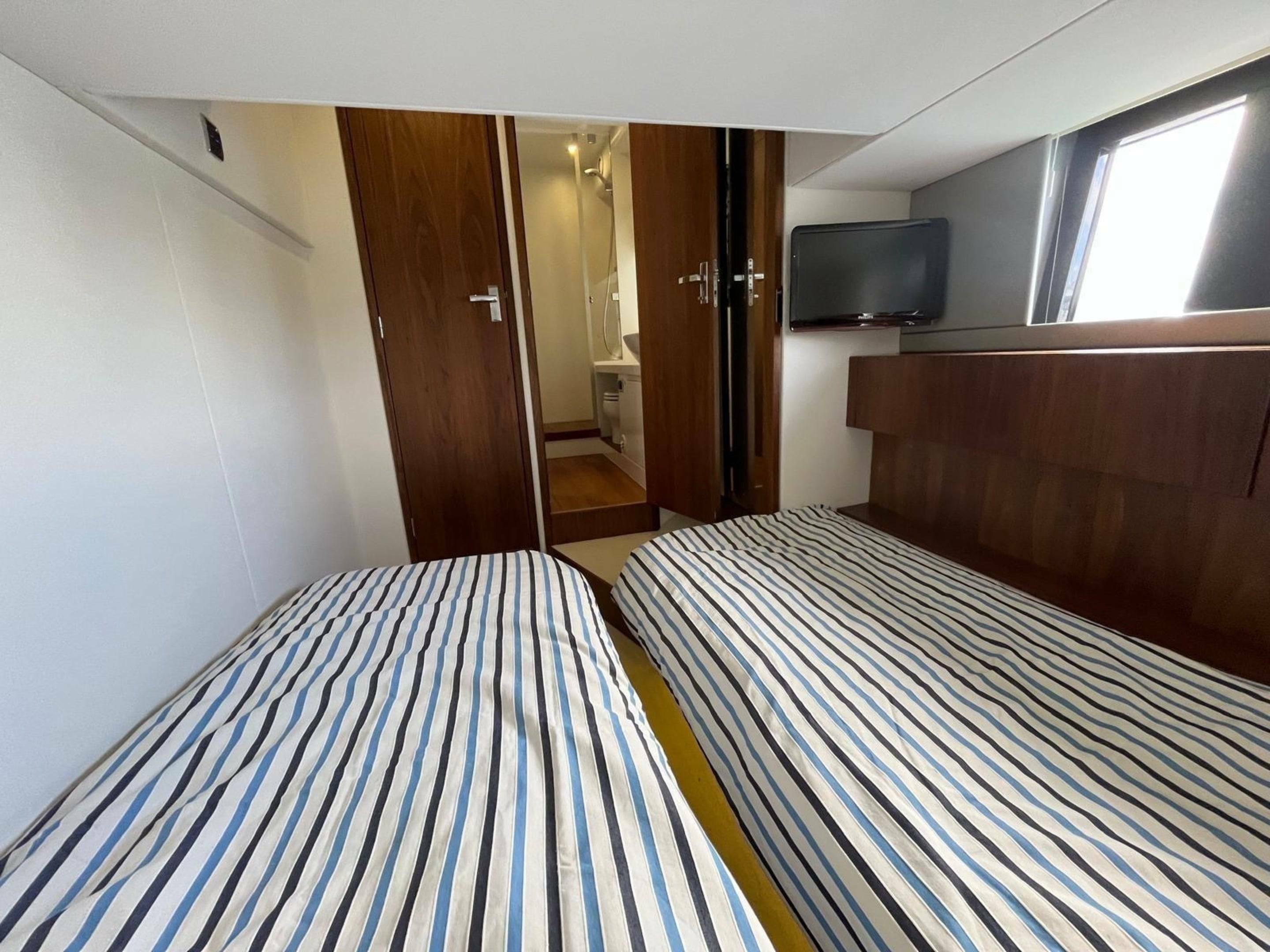 Accommodation - Forward Master cabin with double and en suite. Double Bed Conversion to twin in Port Guest Cabin. Starboard twin cabin.