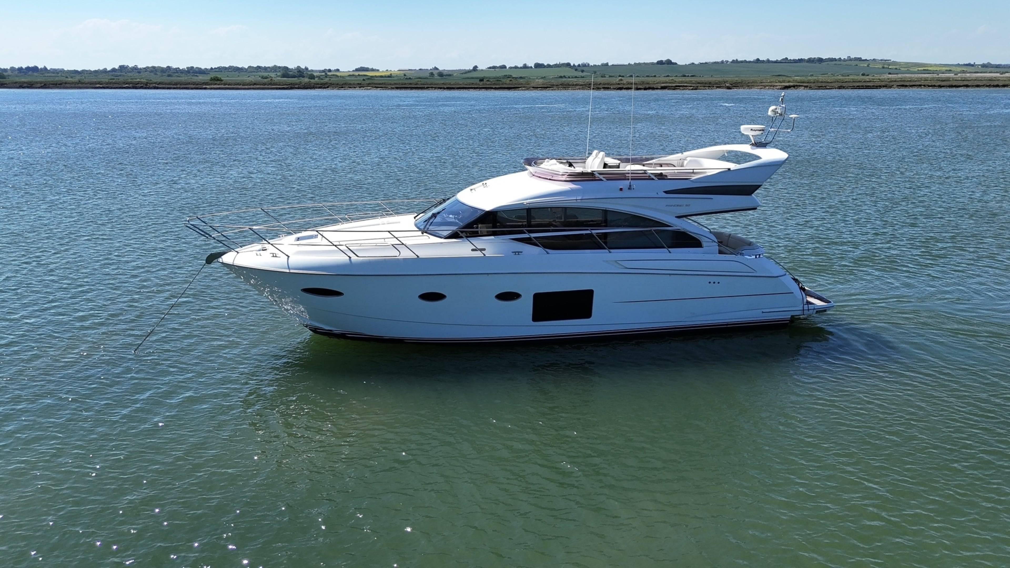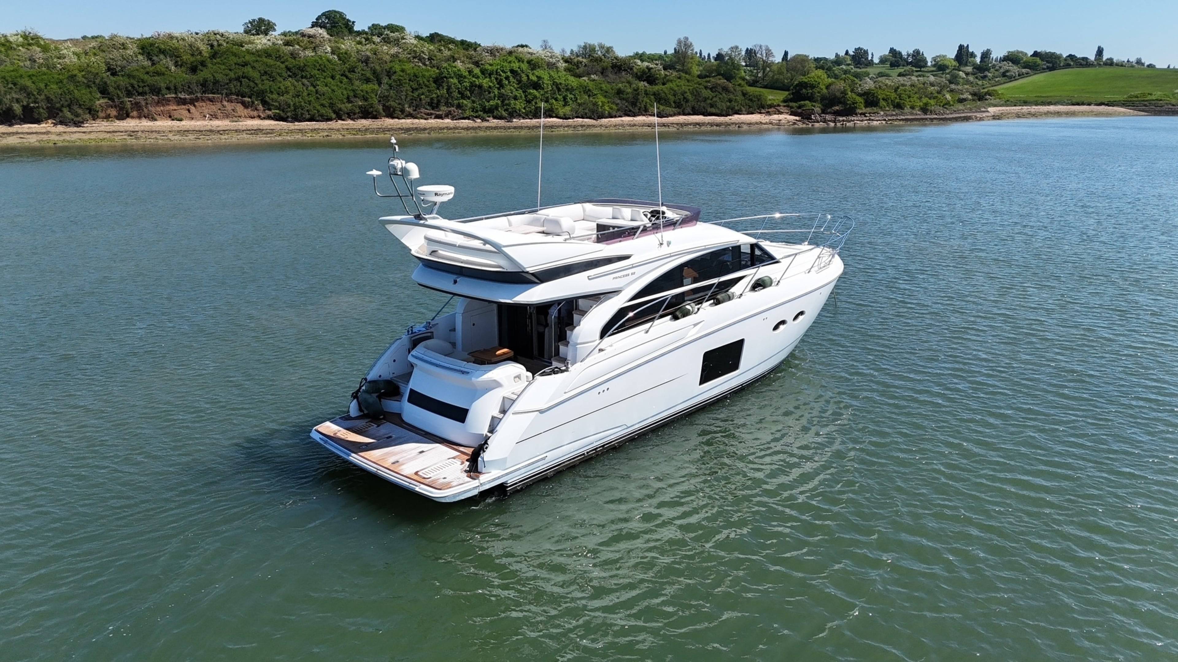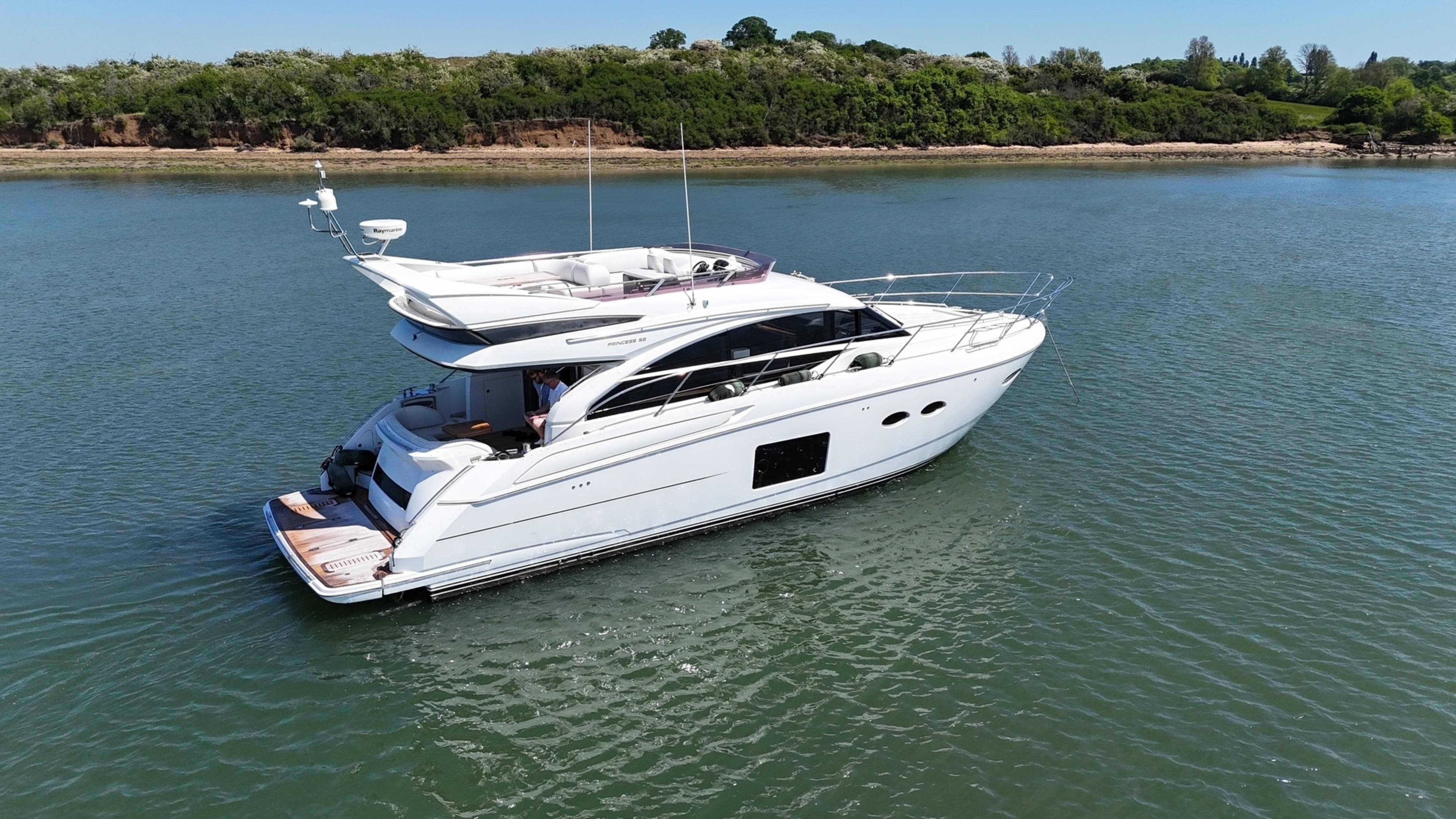 2015 Princess 52! This desirable model comes with a large list of options including: Biggest engine option, twin Caterpillar C-12 715hp // Gyroscopic stabilizer // Reverse cycle air conditioning & heating // Hydraulic letterbox passarelle // Cummins Onan generator // Hydraulic hi-low bathing platform // Fusion speaker system // Security camera system // Sidepower yacht controller // Variable speed bow & stern thrusters // Satin walnut interior // 3 cabin layout // Raymarine radar, plotters and autopilot // Stern docking winches // Washer/dryer // Electric hi-low table to saloon // Electric hi-low TV to saloon // Anchor chain counter // Starboard cabin bed conversion twin/double // 2x fridges to interior // Sink and BBQ wetbar to flybridge // Aft lazarette. For more information please call Boats.co.uk on 01702 258885 or email sales@boats.co.uk