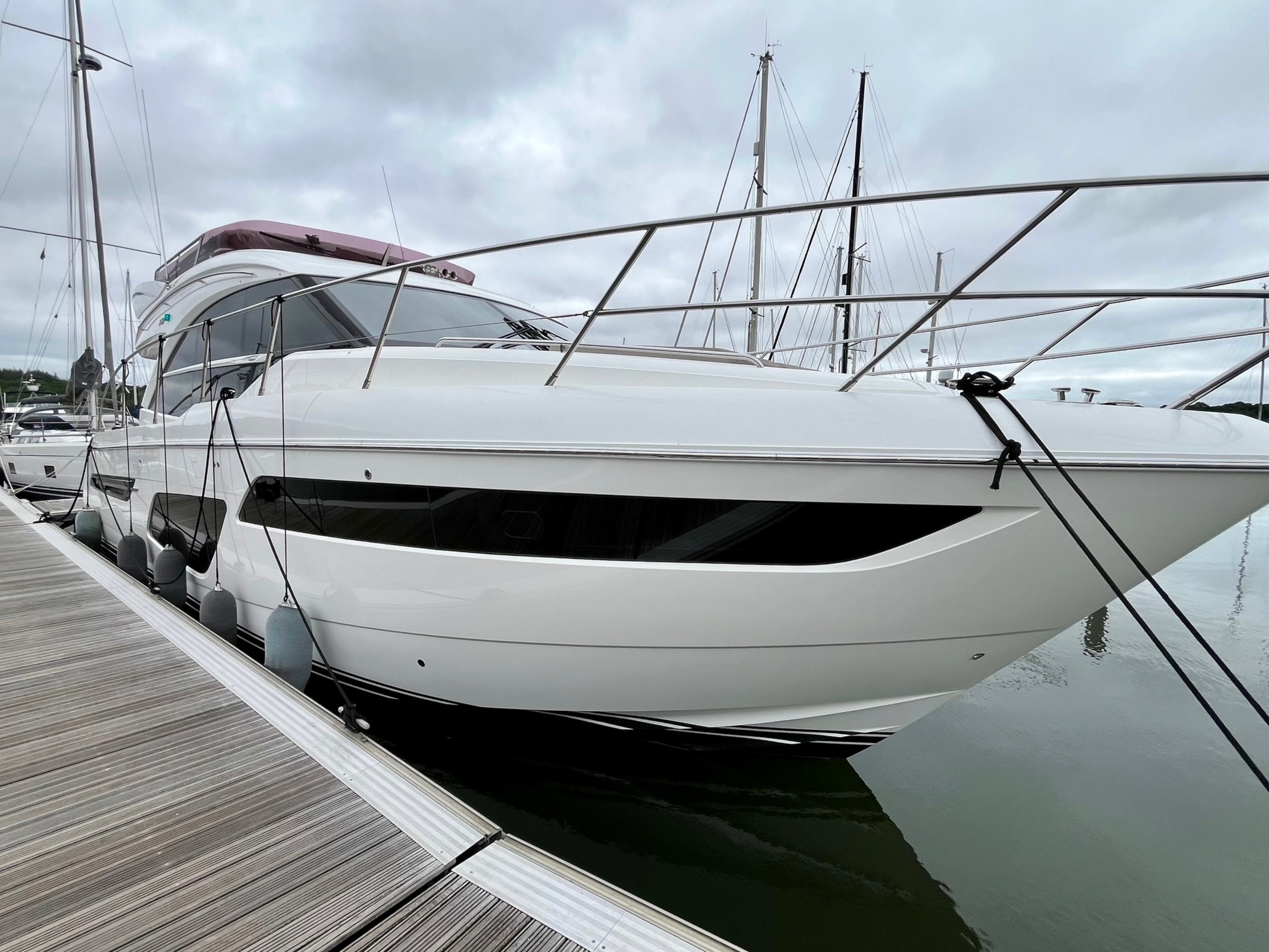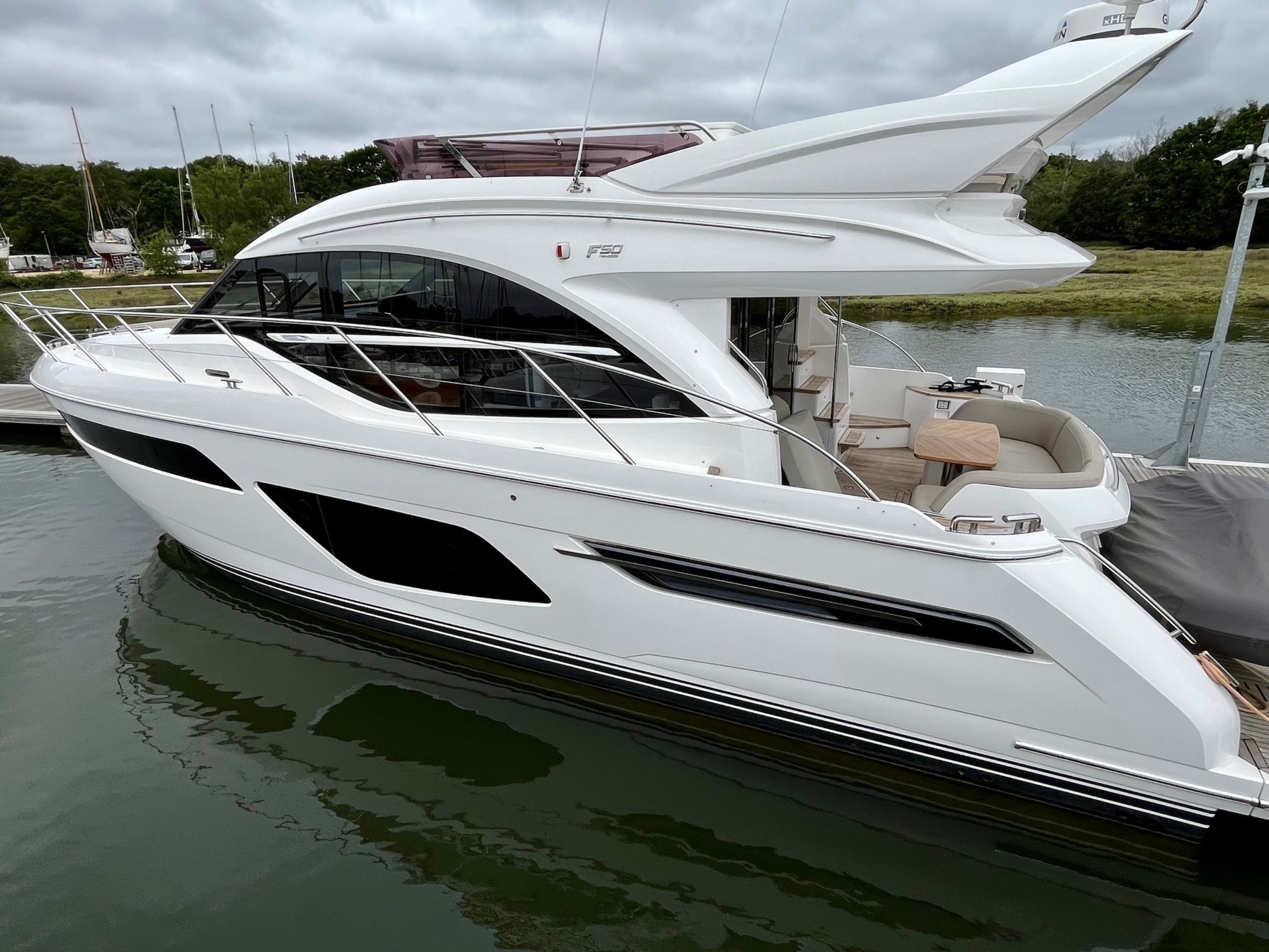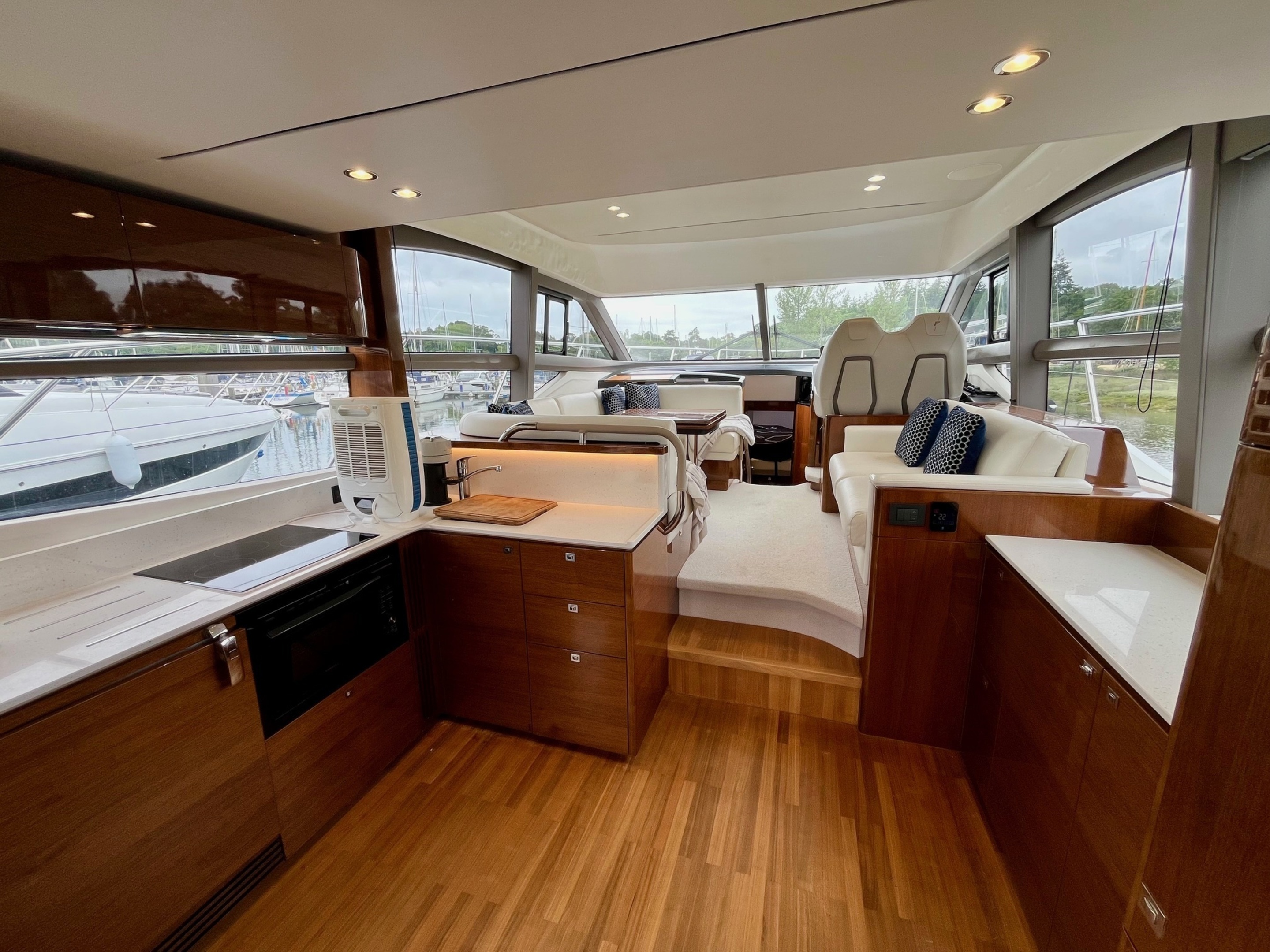 Stereo - PREMIUM AUDIO SYSTEM - Deck Saloon - Harmon Kardon 2.1 Blu-ray system with Bluetooth connectivity & KEF speakers (when optional TV is selected) / Cockpit - Fusion RA200 radio with waterproof speakers linked to the saloon. Harman Kardon unit / Flybridge - Fusion MS-UD650 radio/iPod/MP3 player with waterproof speakers