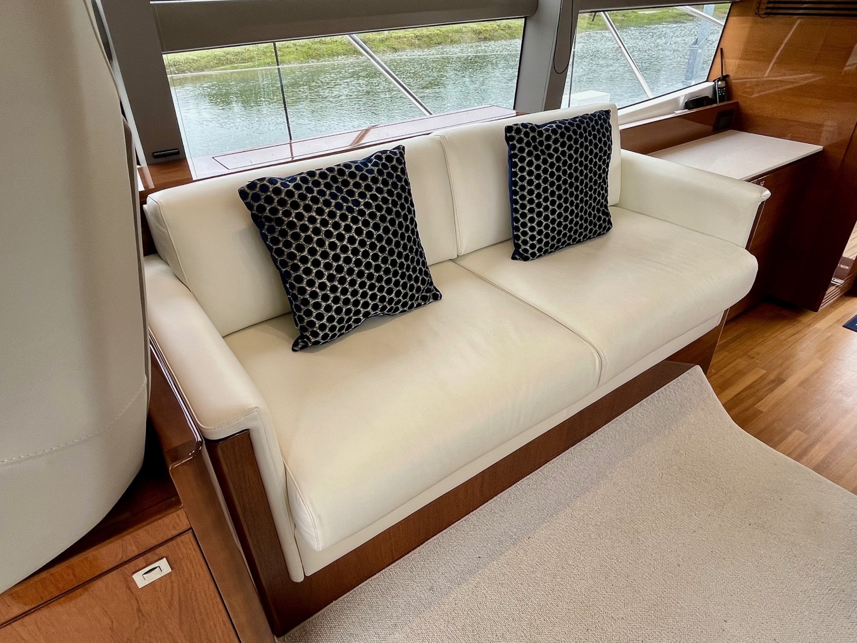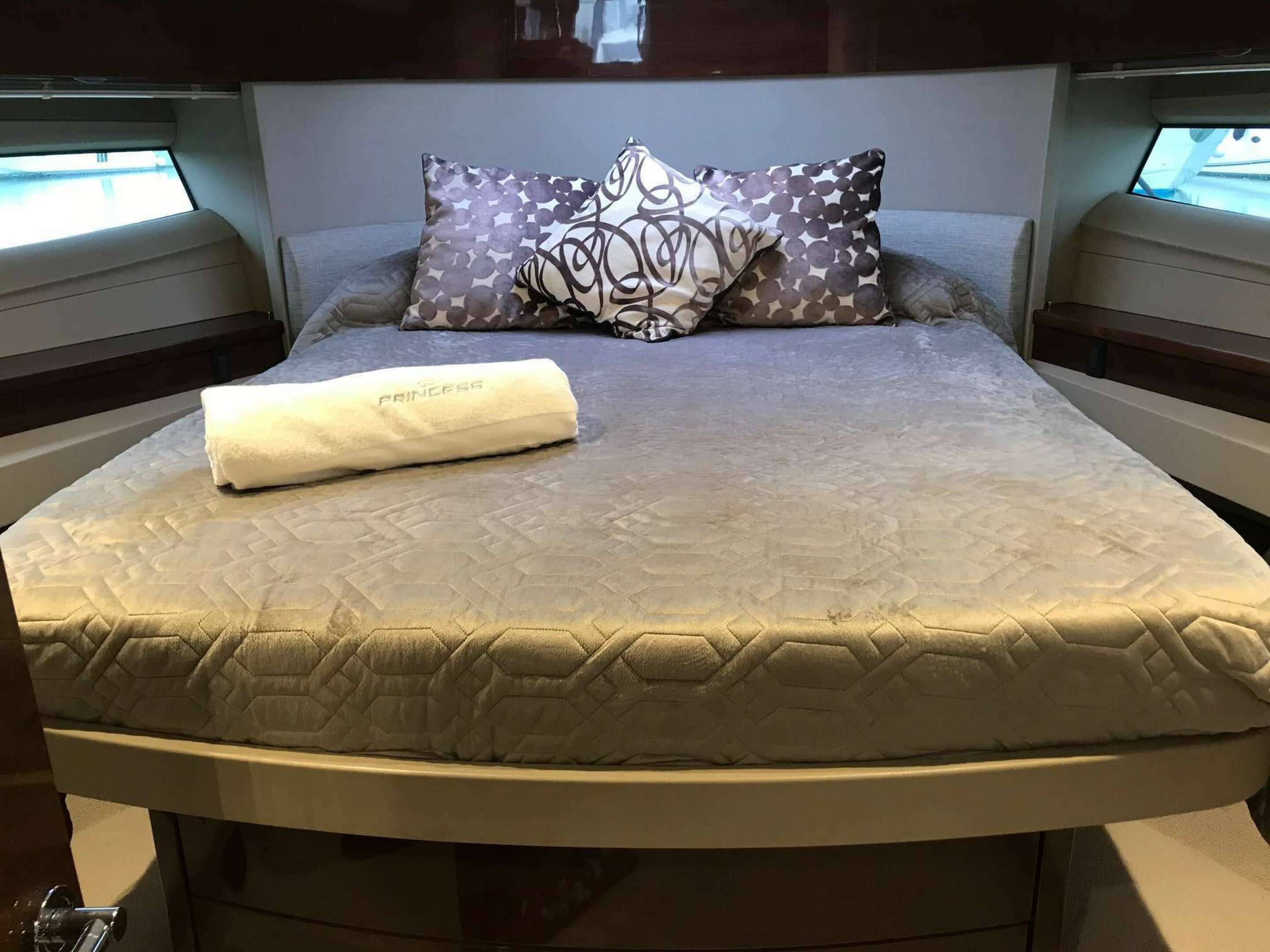 Upholstery and Interiors - Carpet - Linen / Patio Door Curtain - Blooms Linen Argent / Saloon Sofas - Aura Nutural 7559/03 from Platinum IV Collection / Owners Stateroom Bedding: Platner Liner / Bedhead: Jamie Silver Grey Z343/01 / Sofa: Oleron / Forward Cabin Bedding: Platner Linen Z392/01 (fitted bedcover - no bedlinen) / Bedhead: Aros Silver 02 Starboard Cabin / Bedding: Platner Linen / All external covers in Charcoal Grey / Soap Dispensers mounted individually either side of the sinks in both Bathrooms / Bound Over carpet to Aft Saloon/Galley Floor / Foredeck Suncusion Cover /