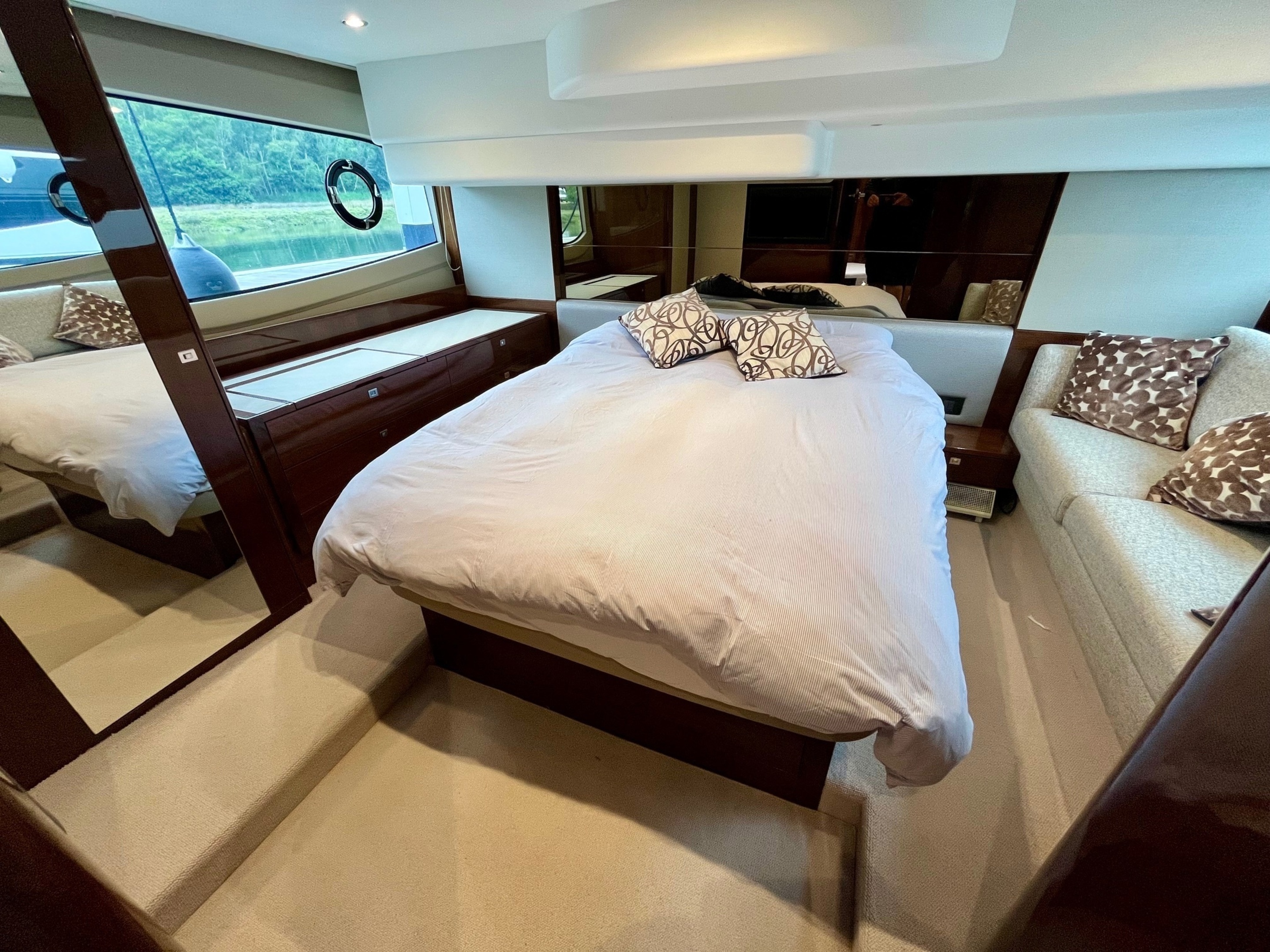 Accommodation - Master stateroom - Large double bed with drawers below, wardrobe with shelves, dressing table, sofa and ensuite bathroom / Forward guest cabin - Large double bed with drawers below, wardrobe with shelves, vanity unit, deck hatch with skylight and blind and ensuite bathroom with day access / Starboard guest cabin - Twin beds and wardrobe with shelves