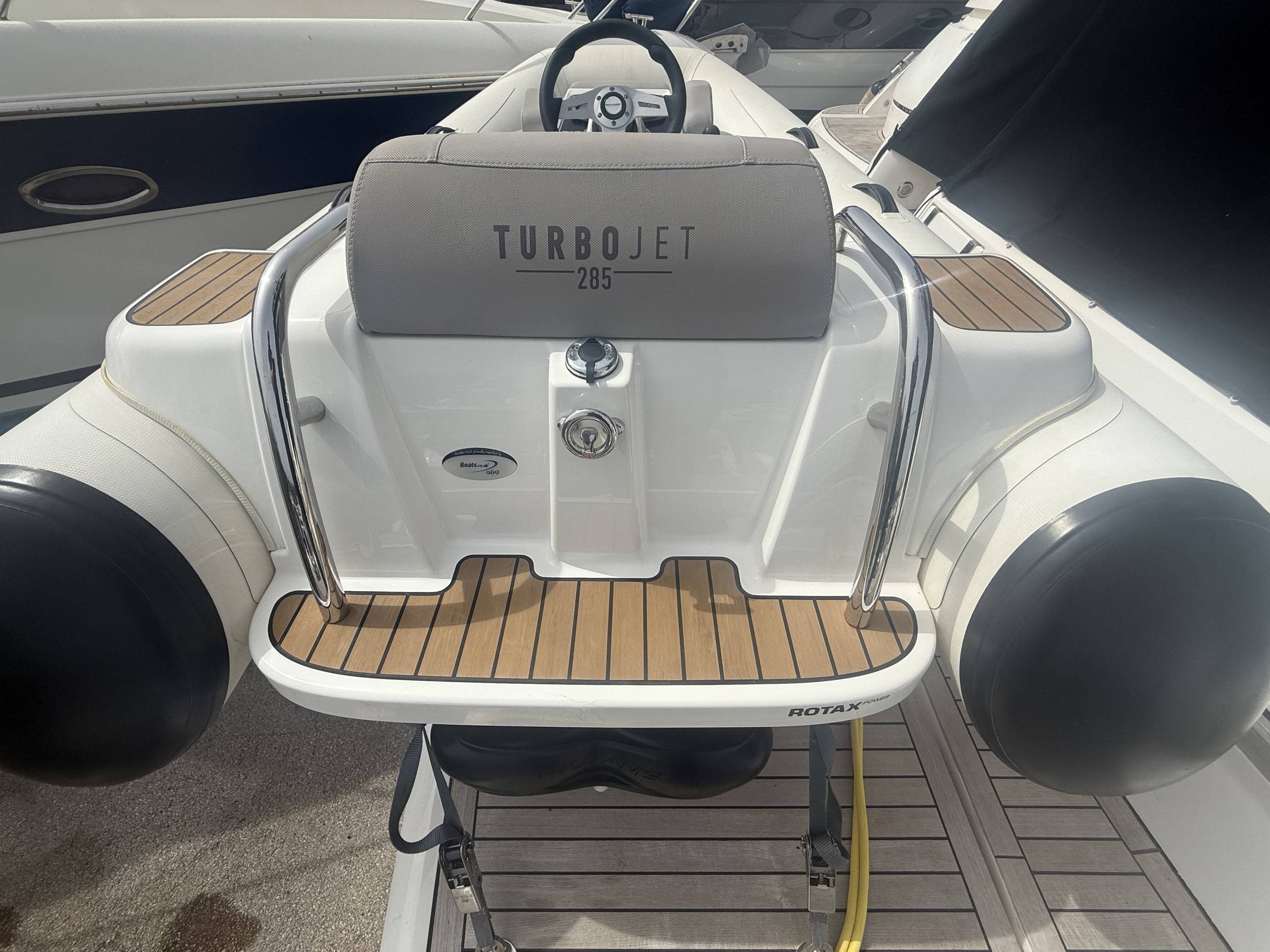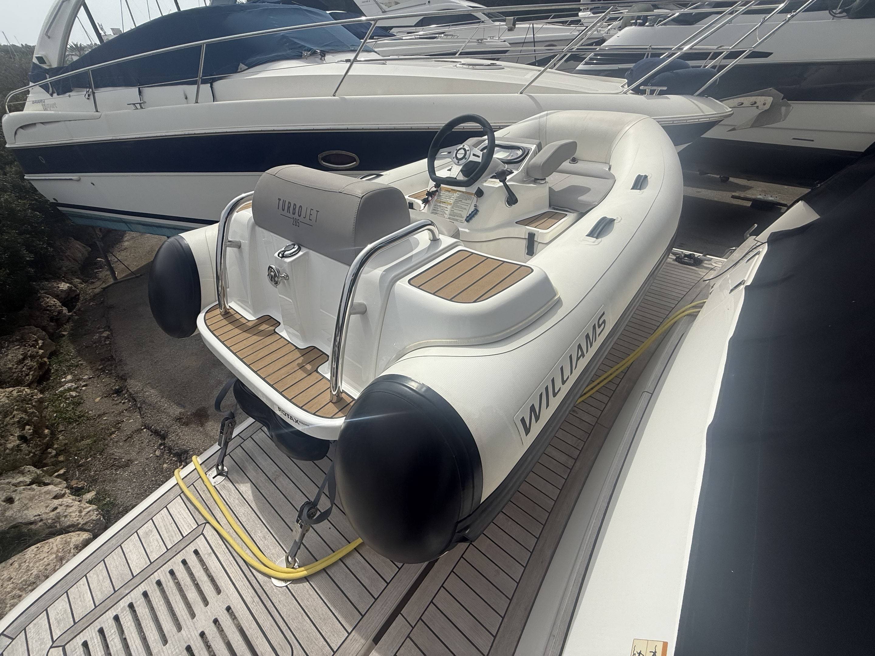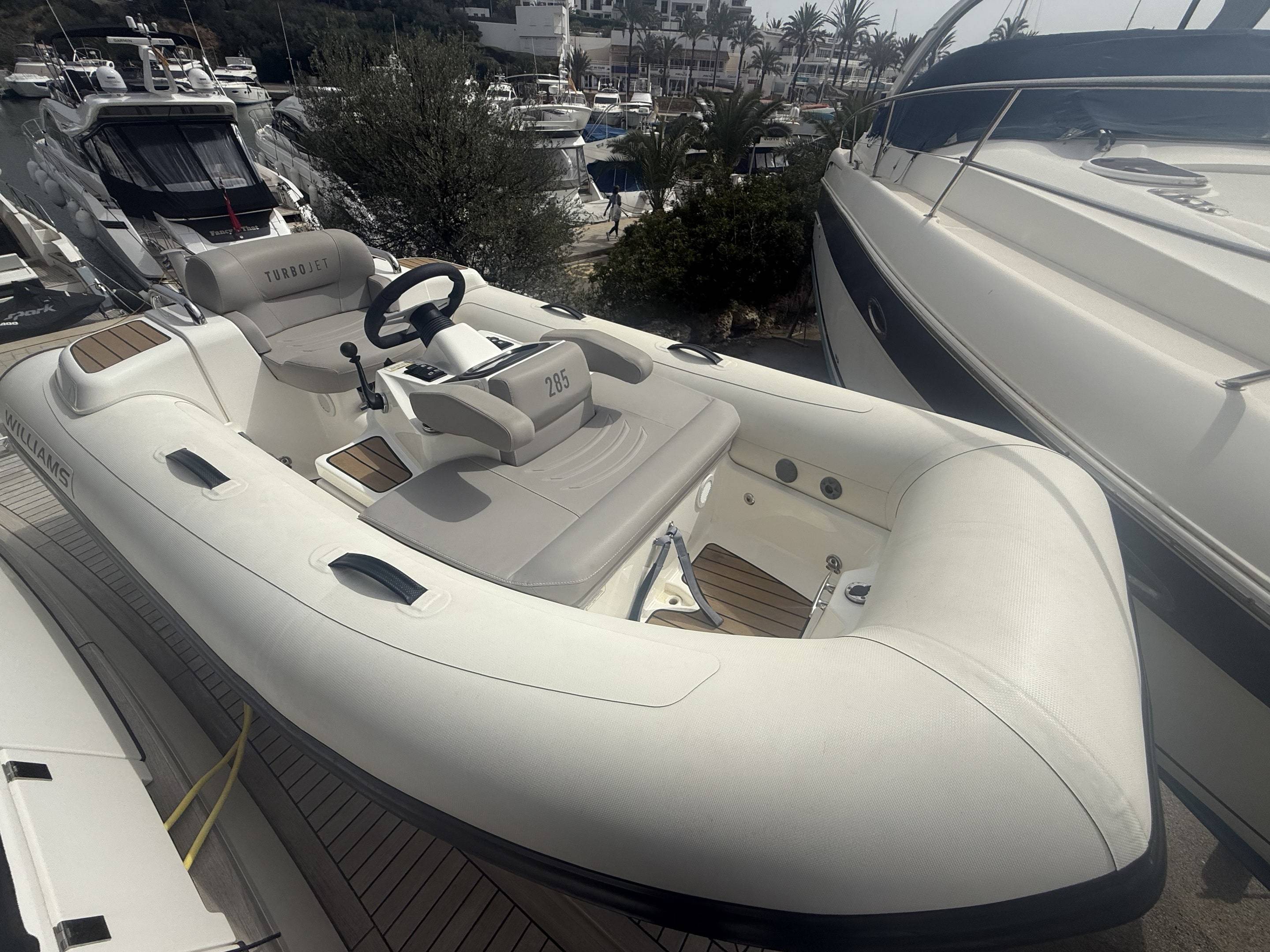 2021 Williams Turbojet 285 90HP Rotax 900 BRP 3 Cylinder engine with approx 17 hours. Available now, This is a preowned 2021 Turbojet 285 with the Rotax engine. Specification includes: White & Black Tubes, Grey Upholstery, Teak pods and footwells, Overall cover, Under-seat storage, 12v DC socket, Sealed upholstered seating (removable). Sports boat hull shape, Piped deck drains, Automatic fire extinguisher, Speedometer (GPS), RPM gauge with digital hour metre, flushing point, Towing eye and navigation light. Its in like new condition and ready to go laying in Cala d'or Mallorca! Call BoatsCo today for more details.