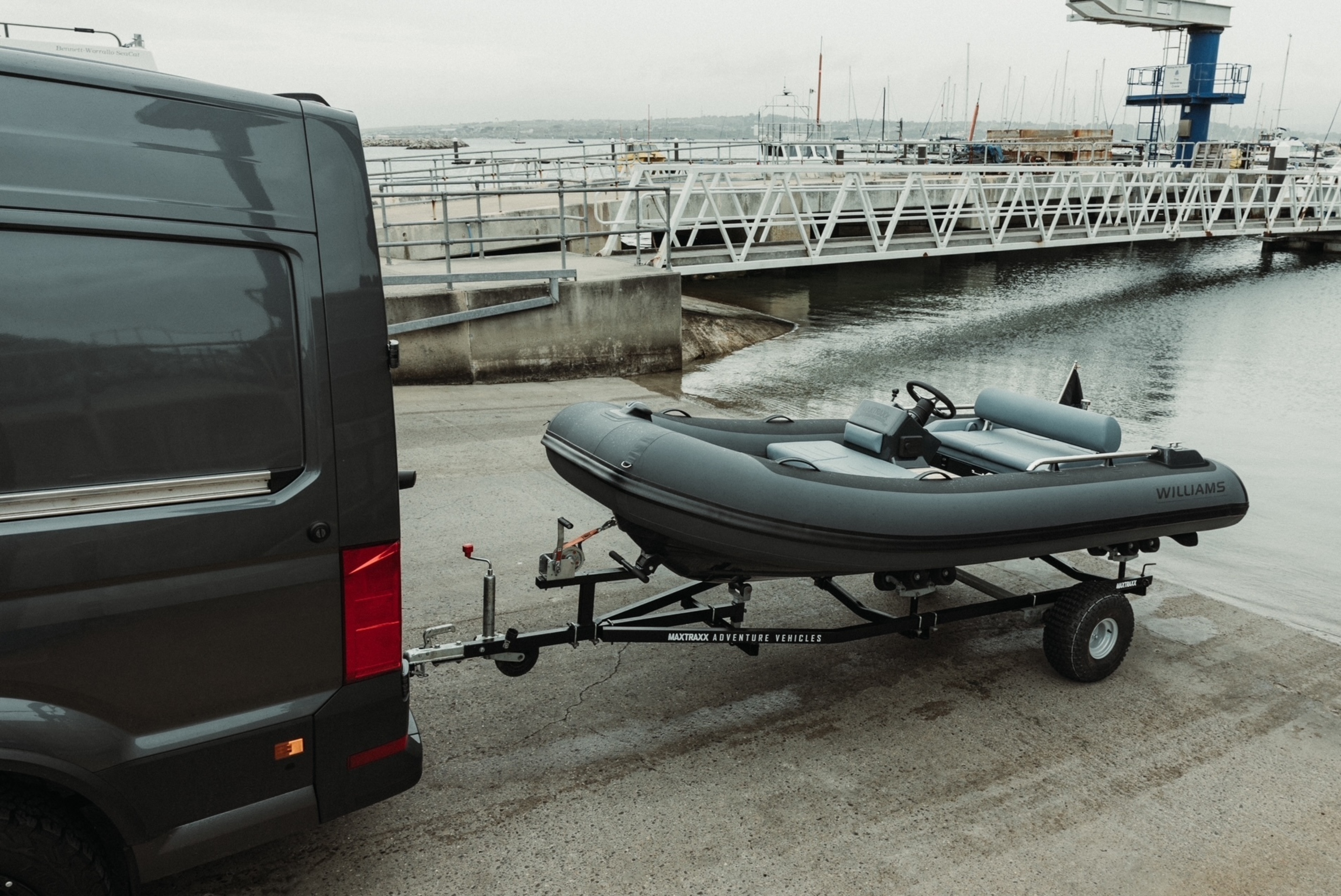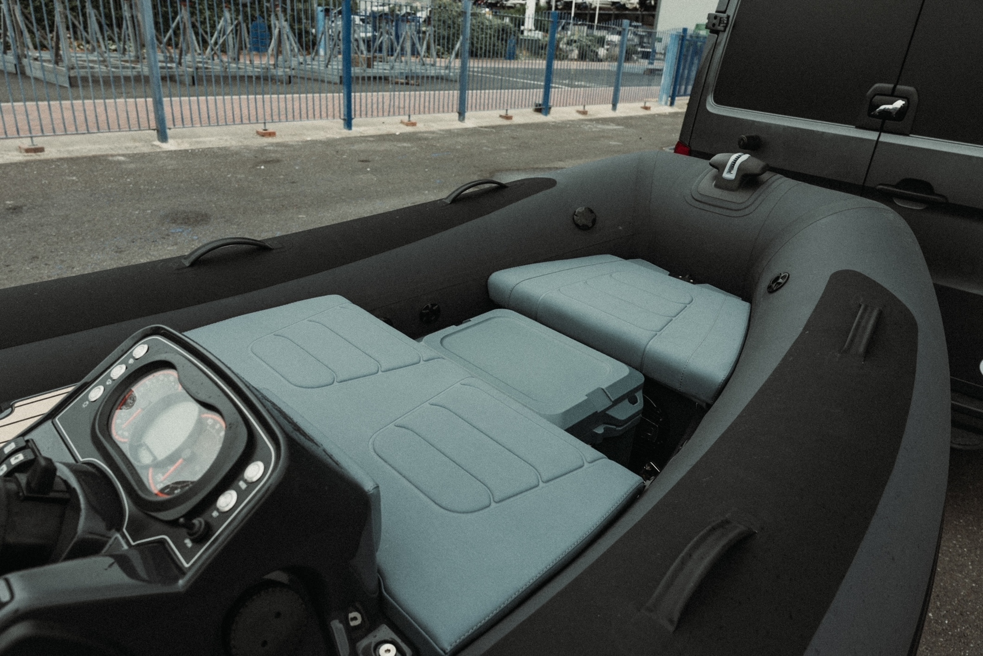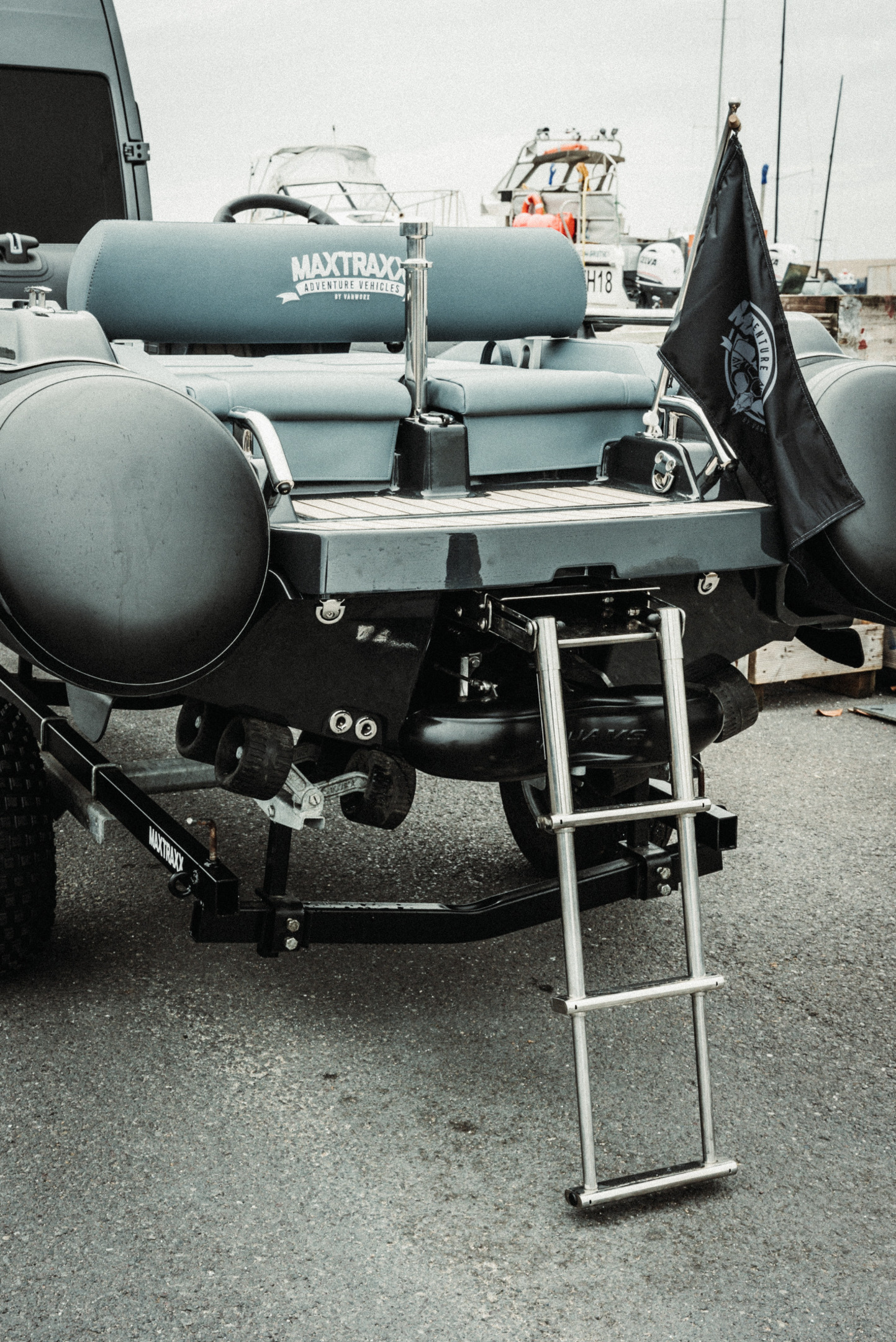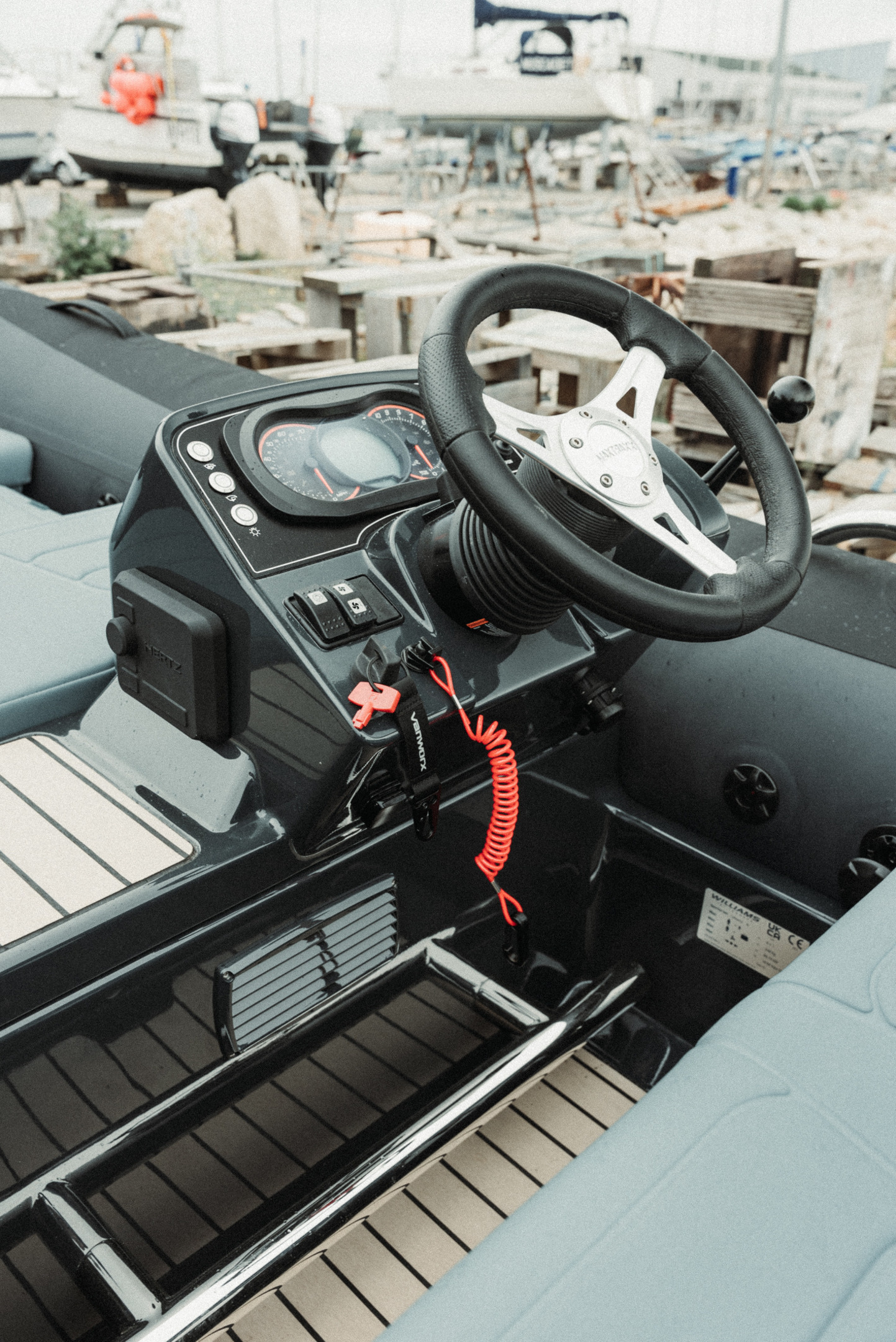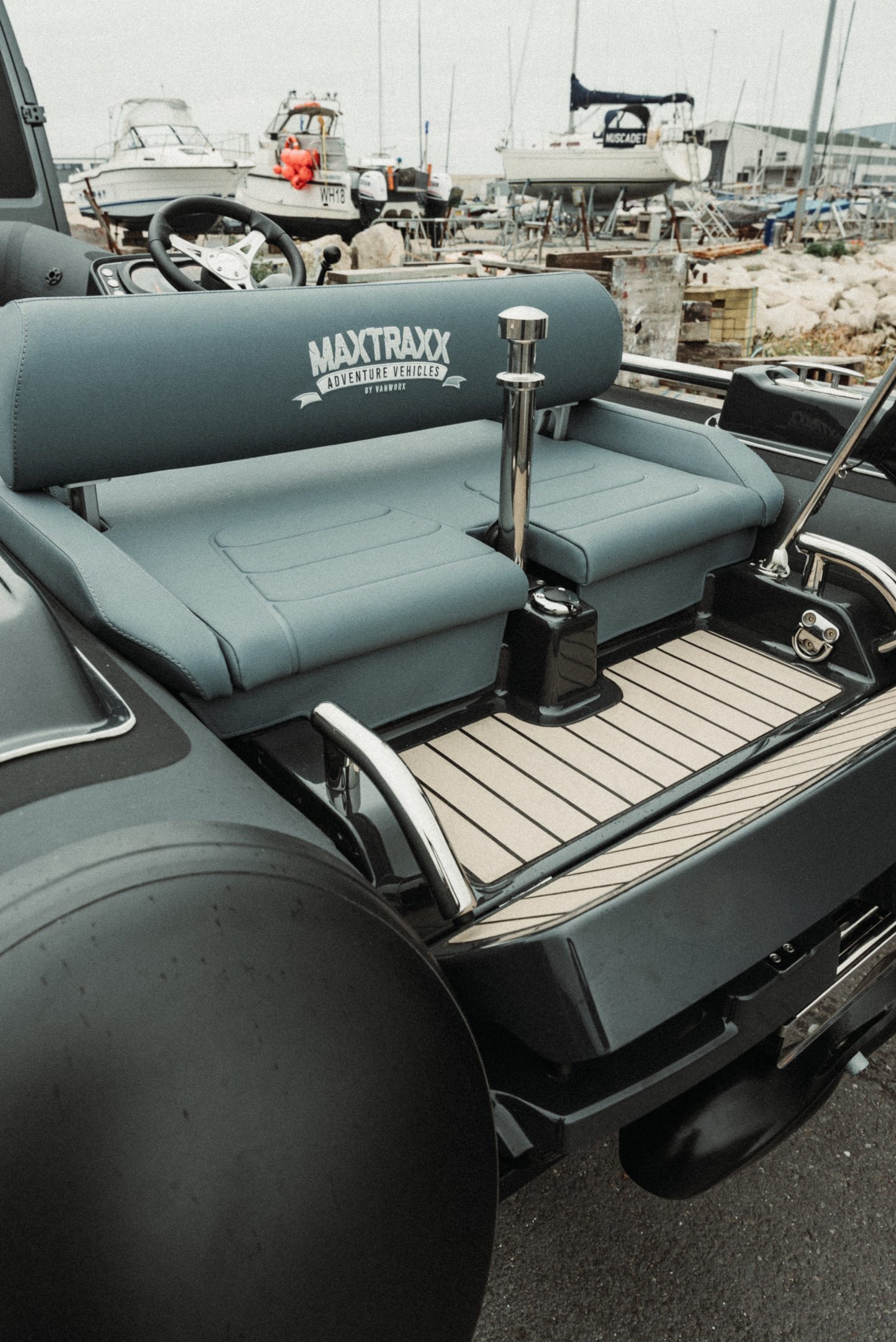 FOR SALE; 2023 WILLIAMS SPORTJET 395 "MAXXTRAXX". This is a beautifully customised Williams Sportjet 395 by the Vanworx Company who specialise in bespoke offgrid 4 x 4 camper vans. This William was completed for a customised show piece and is now available to buy. The Fitted options are; Customised Black and Military Grey Hypolon Tube / LED Deck lighting / Boarding pole / Full automatic tube inflation system / Bleached look Teak with Black caulking / Custom Upholstery / Overall cover / Music system & speakers / Cool box / Supplied on a customised matching trailer. The “MAXXTRAXX” edition adds a whole layer of rugged luxury, especially with Vanworx’s touch. With the custom colour scheme, bleached teak decking, and automatic tube inflation, it’s not just looks its also user friendly. For more details or to arrange a viewing please contact Boats.co.uk on 01702258885 or Email Sales@boats.co.uk