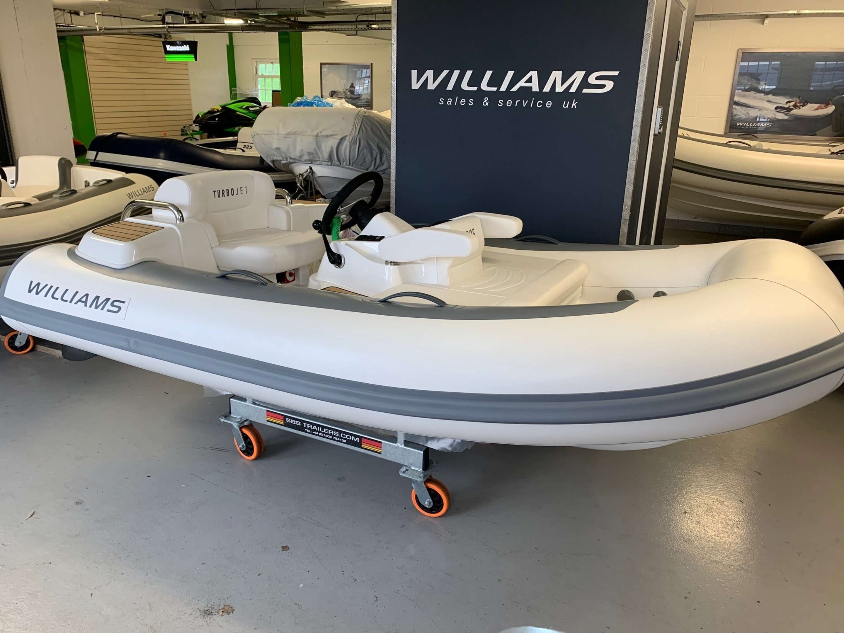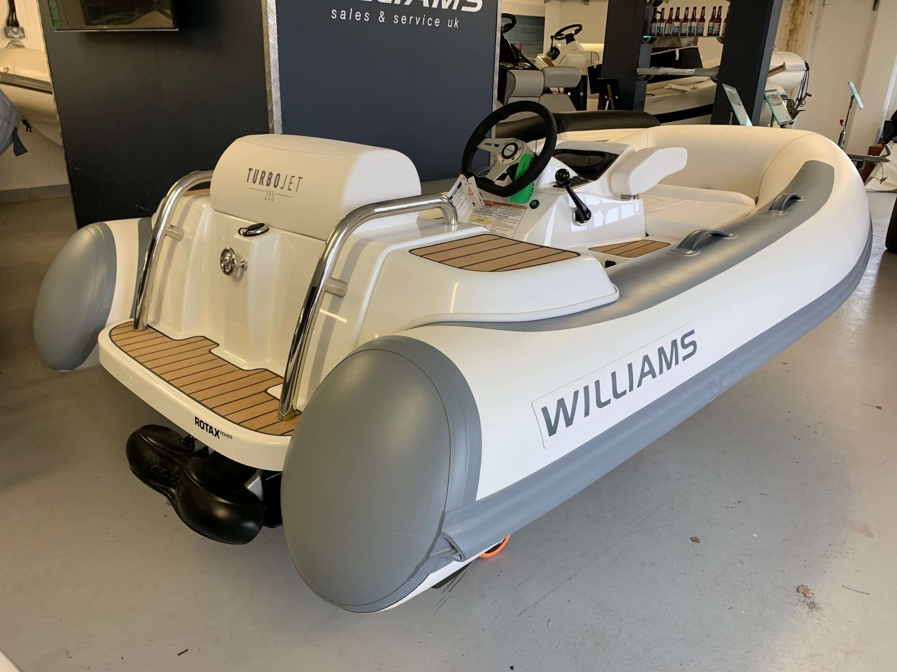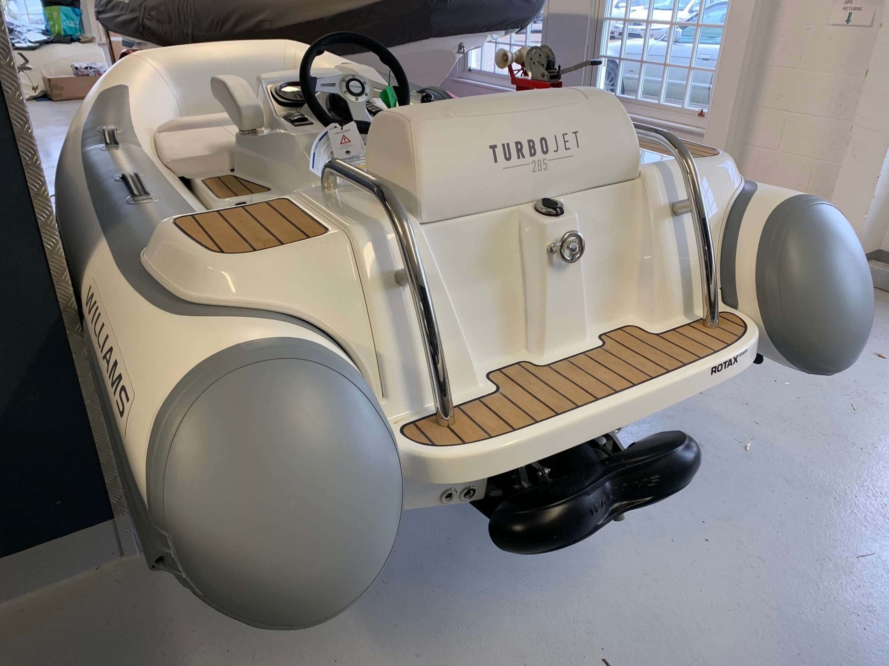New 2021 Williams Turbojet 285 with the BRP Rotax ACE 900 - 90HP 3 Cylinder engine. New updated version of the Turbojet 285 with a sleeker style and lighter overall weight. Option included; Teak footwells and side pods, LED lights, Standard specification includes: Under-seat storage, 12v DC socket, Sealed upholstered seating (removable). Sports boat hull shape, Piped deck drains, Automatic fire extinguisher, Speedometer (GPS), RPM gauge with digital hour metre. Fuel gauge, Single lever throttle/Shift control. Plug in navigation lights, (Port/Starboard/Running), Stainless steel rear handles, Forward seat neoprene/Fabric grab handles, Engine flushing attachmnent, Bow U Bolt, Four lifting pad-eyes, Ski eye, Two rear tie down points, Automatic bilge pump, Bilge blower, Battery isolator, ube repair kit, Footpump (2 Stage), Owner's manual, Fitted fuel tank, Hand-made inflatable tube with rubstrake and grab handles, Folding backrests. A nimble tender that defies its size, the Turbojet 285 is designed to easily fit into the tender garage or bathing platform of most 12m to 16m (39ft to 52ft) yachts. It will take you smoothly to the quayside for supplies or a leisurely bite to eat. But open up the throttle and she'll show you a different side. The sports hull and Rotax engine come into their own, carving tight circles or going flat out in secure straight lines for waterskiing bliss. BOATS.CO.UK ARE THE UK'S DEALERSHIP FOR WILLIAMS PERFORMANCE JET TENDERS. WE SPECIALIZE IN NEW AND PRE-OWNED WILLIAMS. WE CAN PART EXCHANGE AND BUY OUTRIGHT. Contact or email Darren@Boats.co.uk on 01702258885 for more information..