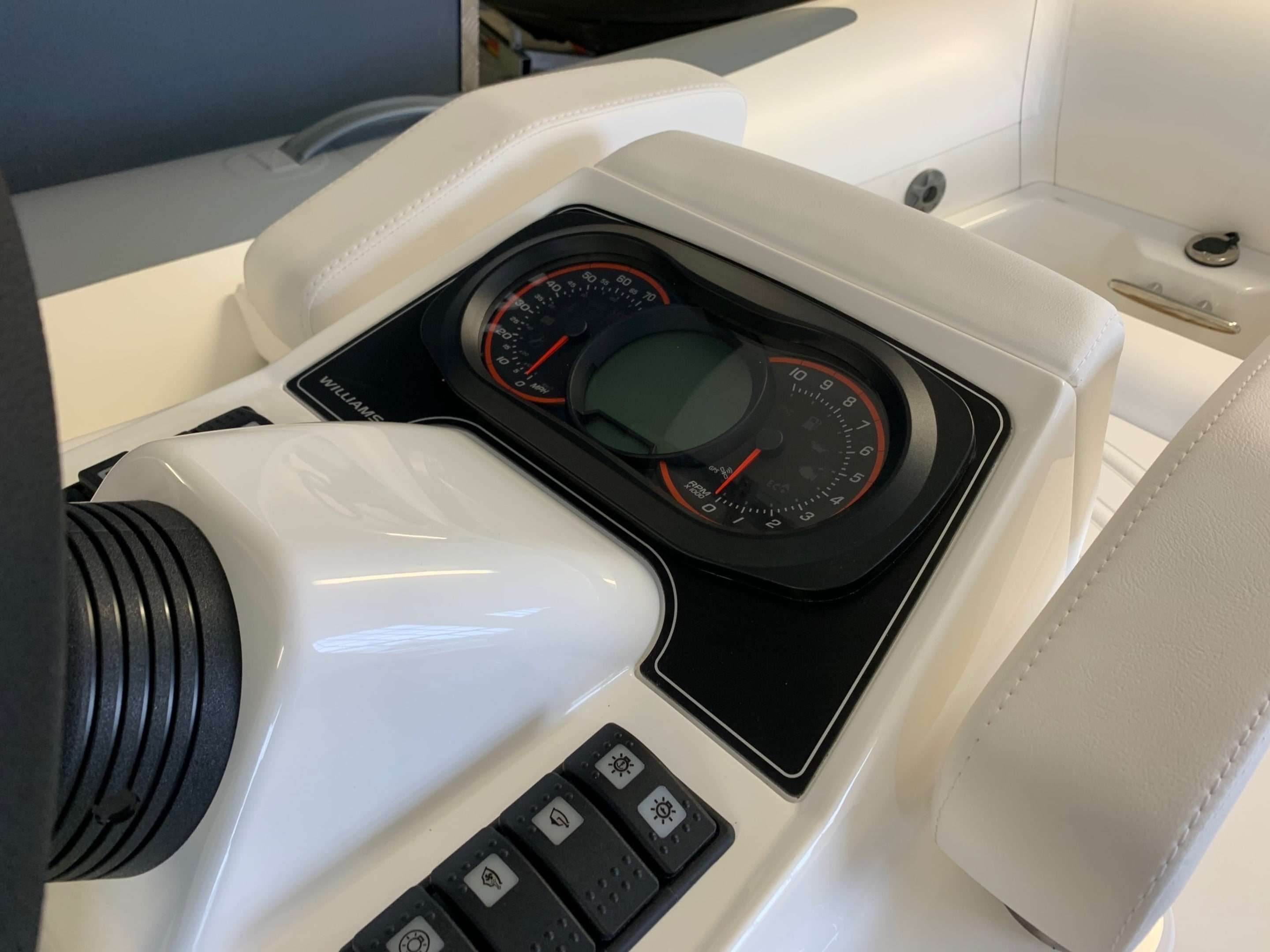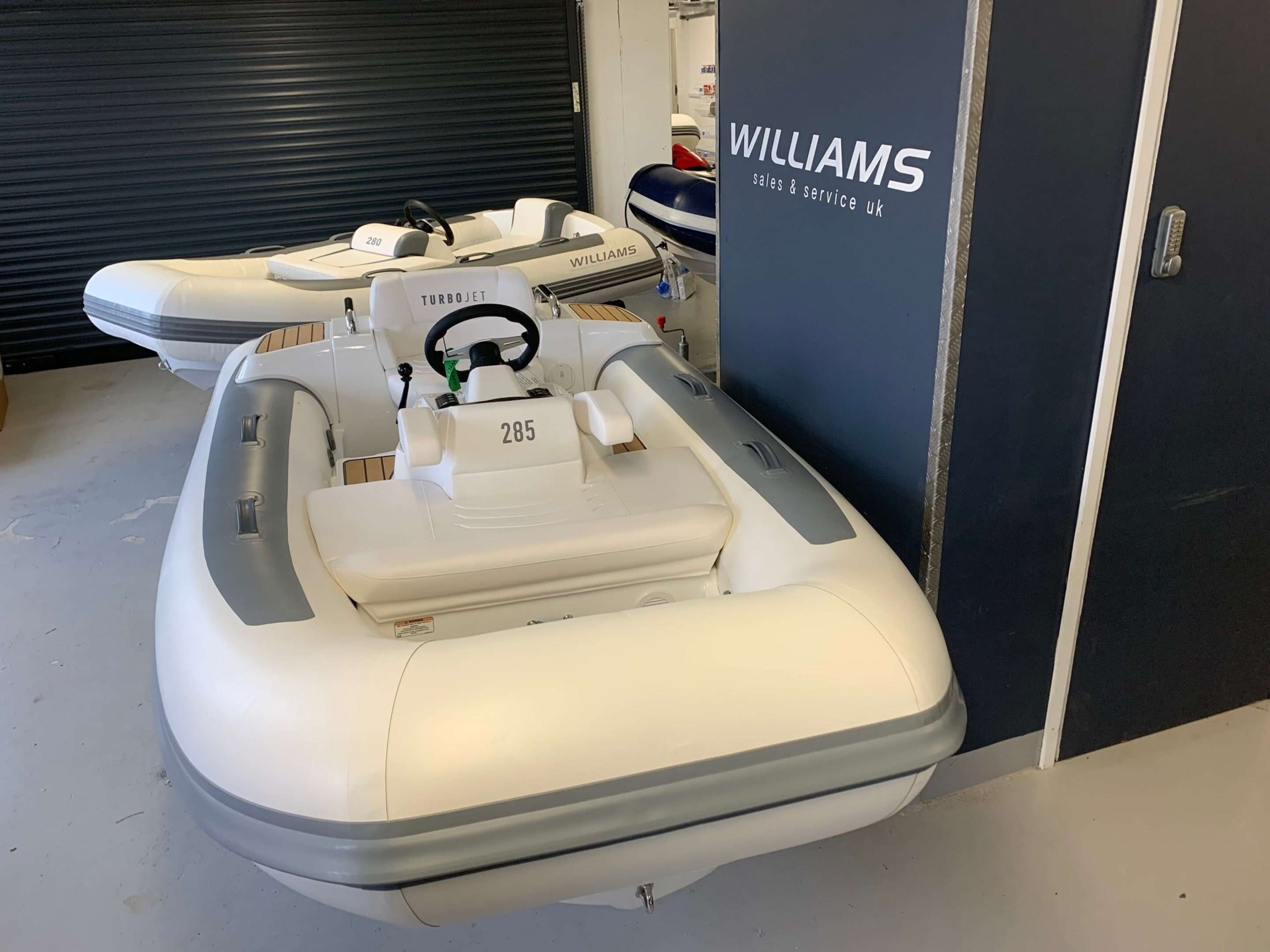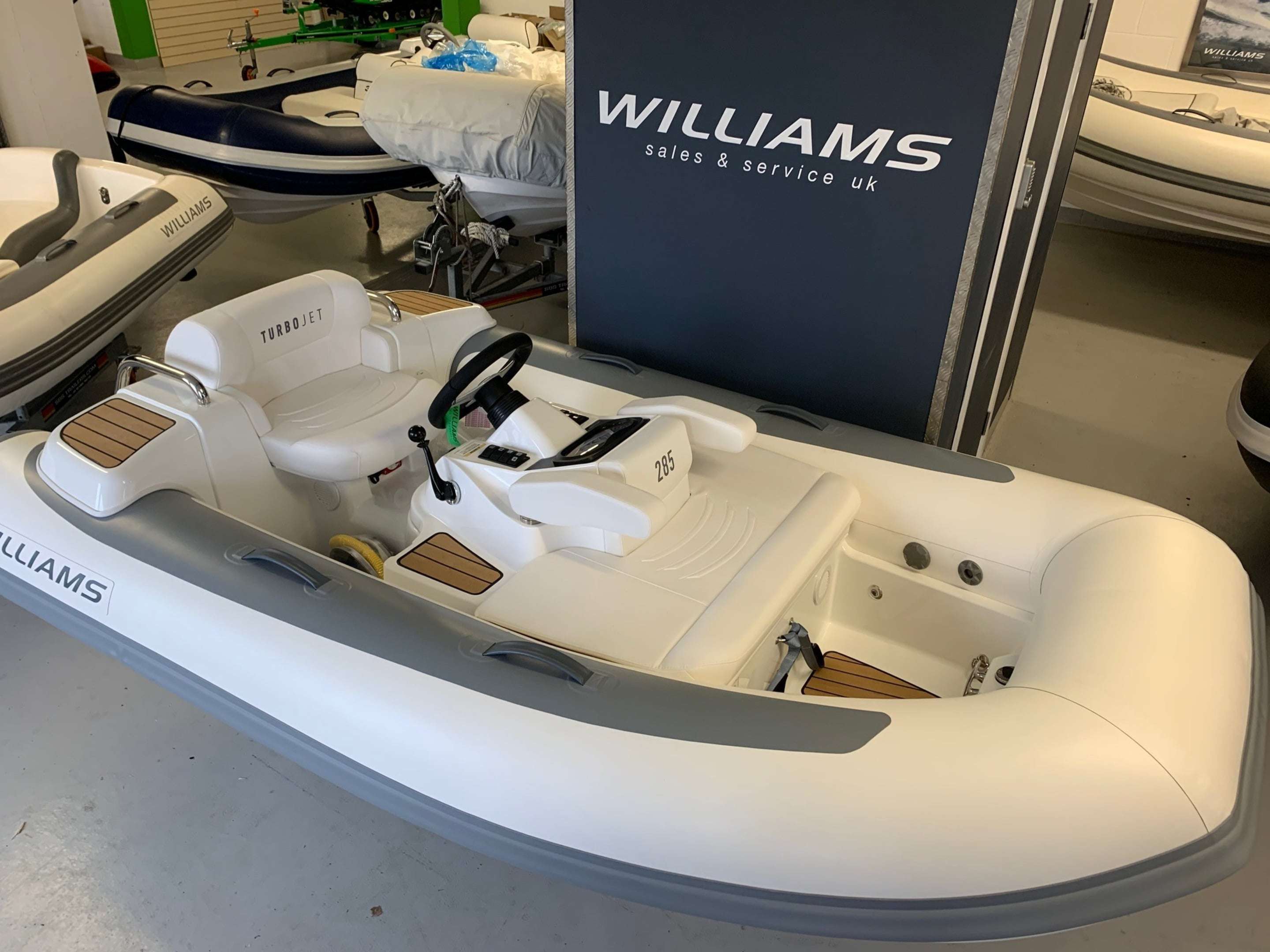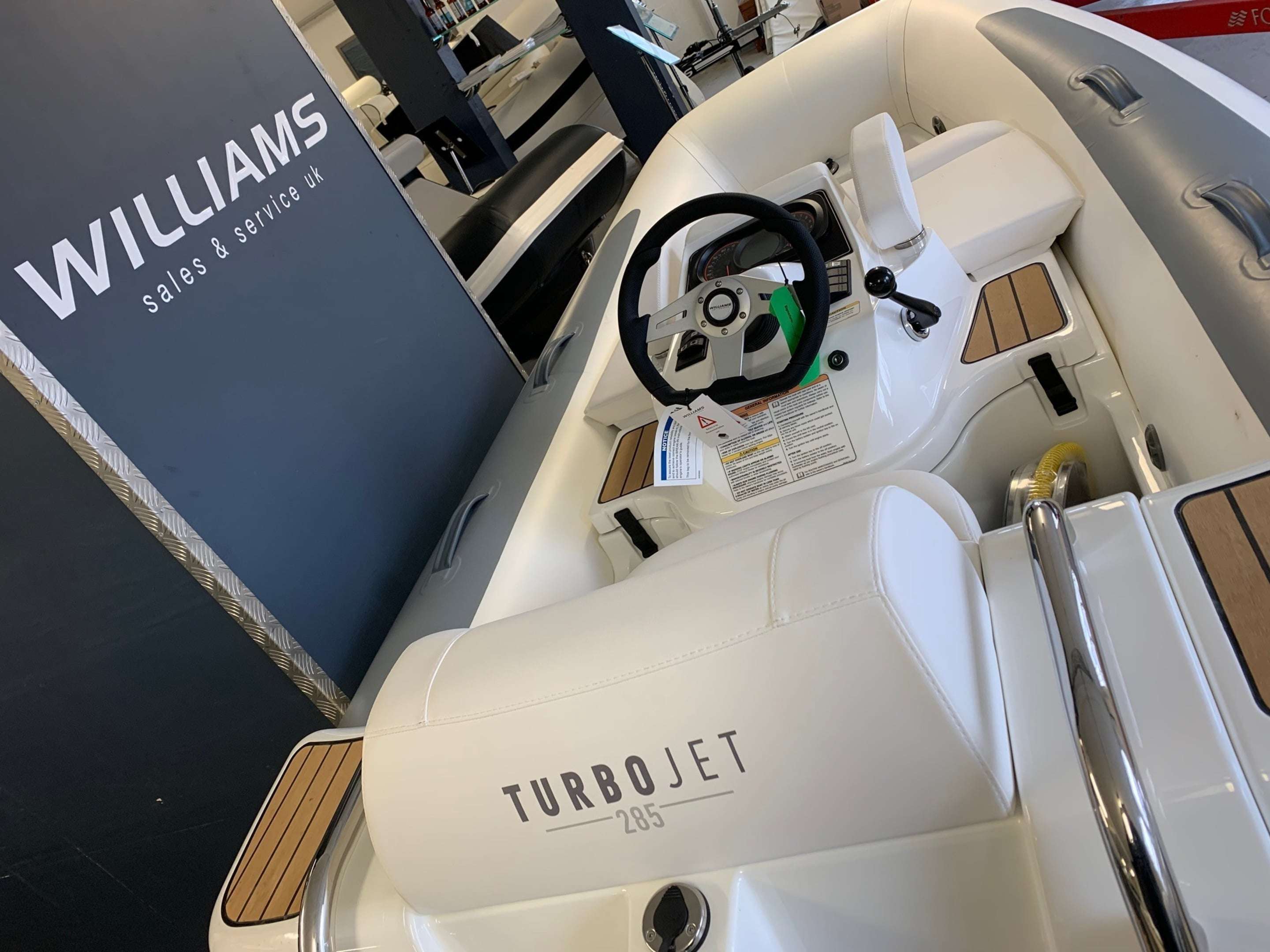 New 2021 Williams Turbojet 285 with the BRP Rotax ACE 900 - 90HP 3 Cylinder engine. New updated version of the Turbojet 285 with a sleeker style and lighter overall weight. Option included; Teak footwells and side pods, LED lights, Standard specification includes: Under-seat storage, 12v DC socket, Sealed upholstered seating (removable). Sports boat hull shape, Piped deck drains, Automatic fire extinguisher, Speedometer (GPS), RPM gauge with digital hour metre. Fuel gauge, Single lever throttle/Shift control. Plug in navigation lights, (Port/Starboard/Running), Stainless steel rear handles, Forward seat neoprene/Fabric grab handles, Engine flushing attachmnent, Bow U Bolt, Four lifting pad-eyes, Ski eye, Two rear tie down points, Automatic bilge pump, Bilge blower, Battery isolator, ube repair kit, Footpump (2 Stage), Owner's manual, Fitted fuel tank, Hand-made inflatable tube with rubstrake and grab handles, Folding backrests. A nimble tender that defies its size, the Turbojet 285 is designed to easily fit into the tender garage or bathing platform of most 12m to 16m (39ft to 52ft) yachts. It will take you smoothly to the quayside for supplies or a leisurely bite to eat. But open up the throttle and she'll show you a different side. The sports hull and Rotax engine come into their own, carving tight circles or going flat out in secure straight lines for waterskiing bliss. BOATS.CO.UK ARE THE UK'S DEALERSHIP FOR WILLIAMS PERFORMANCE JET TENDERS. WE SPECIALIZE IN NEW AND PRE-OWNED WILLIAMS. WE CAN PART EXCHANGE AND BUY OUTRIGHT. Contact or email Darren@Boats.co.uk on 01702258885 for more information..